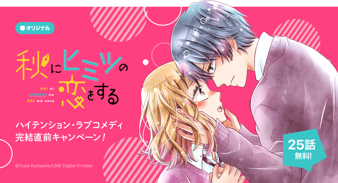 LINE Digital Frontier株式会社(本社:東京都新宿区、代表取締役社長:金 俊九(キム・ジュンク)) は、当社が運営する電子コミックサービス「LINEマンガ」https://manga.line.me/ のオリジナル作品『秋にヒミツの恋をする』(作:栗山優弥)が、5月5日(木)の更新で完結を迎えることを記念し、無料話増量キャンペーンを実施中です。