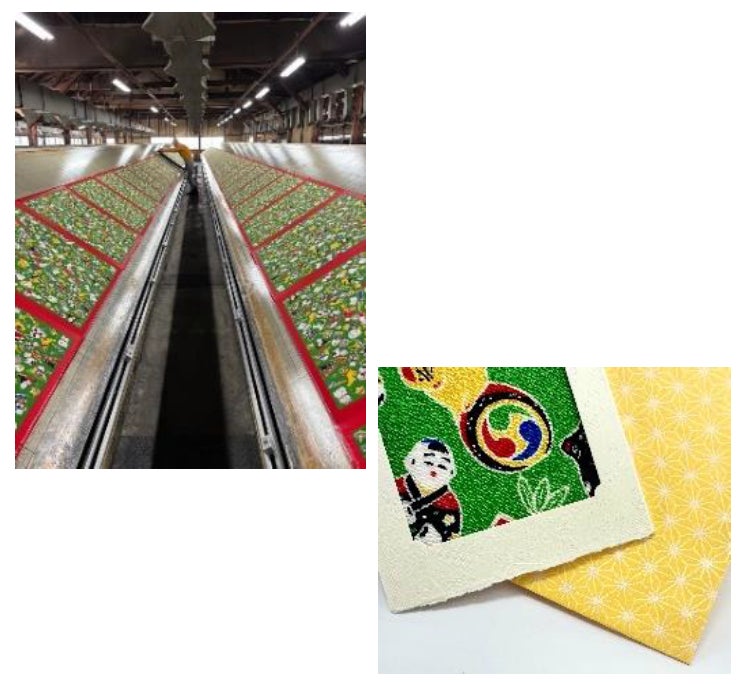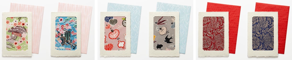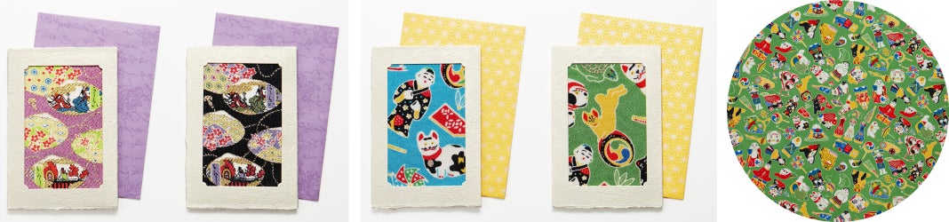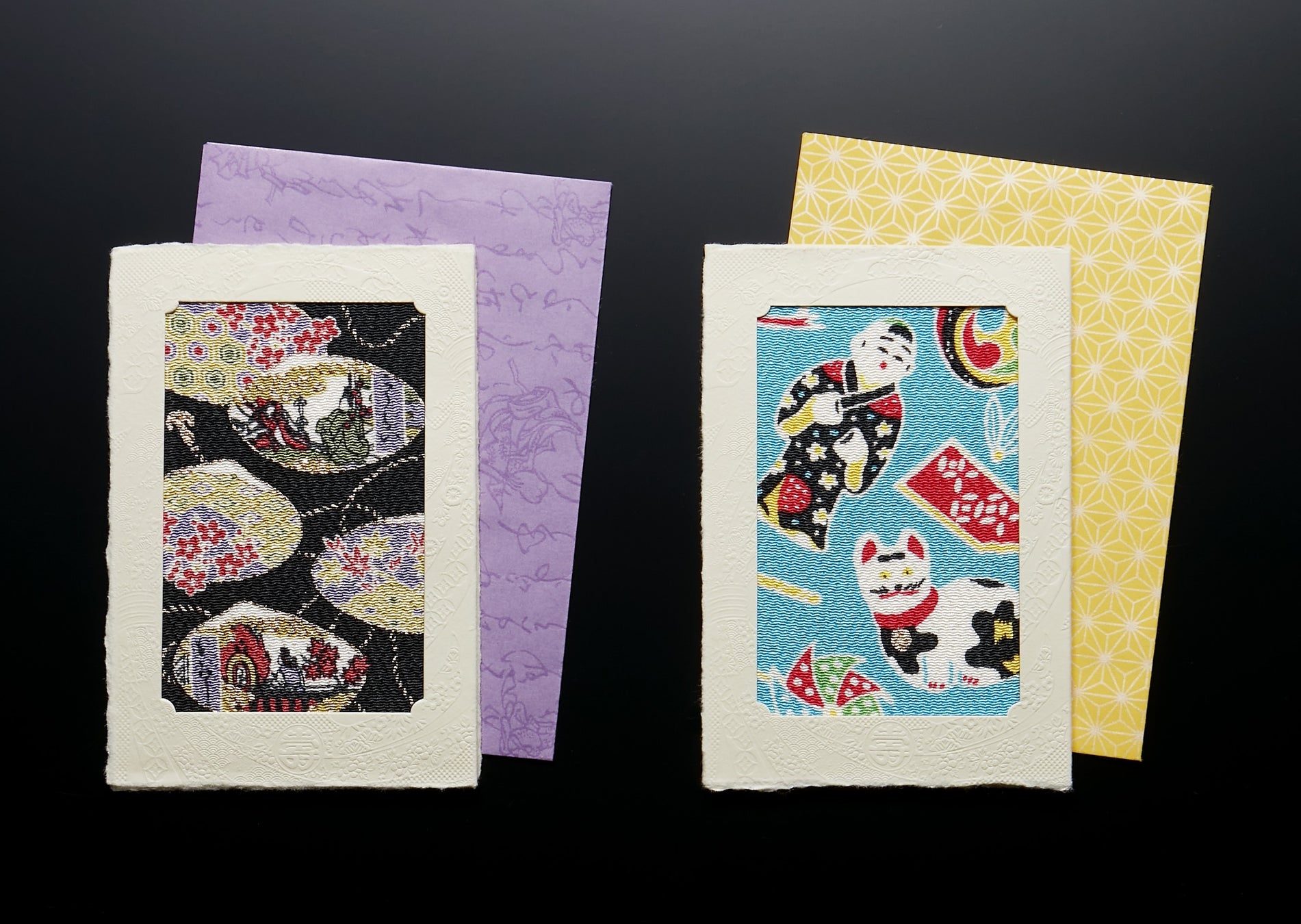 「吉祥花伝」とは、縁起の良い柄(吉祥柄)が描かれた古い着物の生地「古裂(こぎれ)」と和紙のフレームを組み合わせたグリーティングカードです。今回のプロジェクトでは、7月4日(金)に松屋と連携協定を締結した京都府与謝野町の「丹後ちりめん」を挟み込み、「吉祥花伝 KYOTO」として販売します。