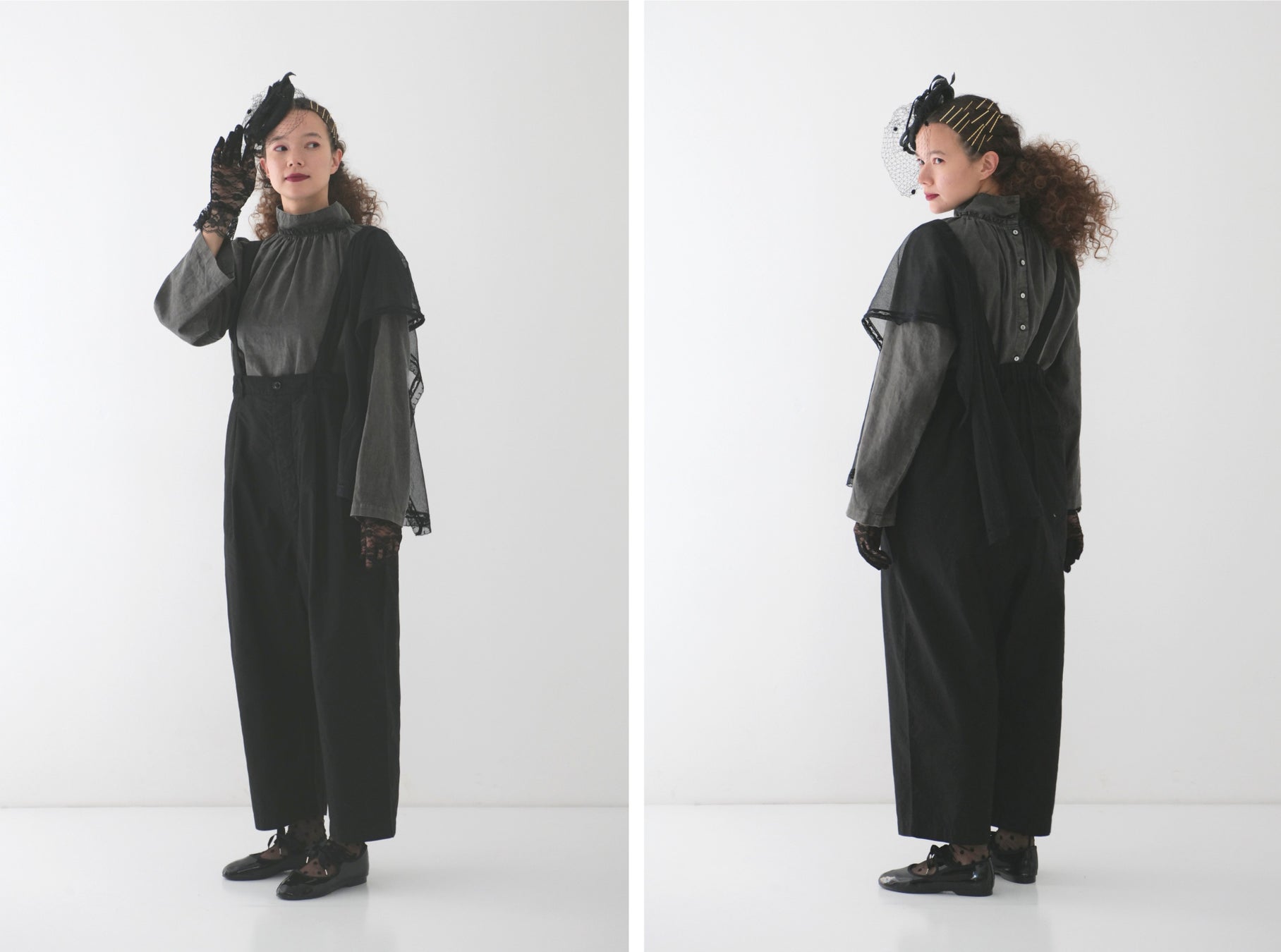 たっぷりとしたワイドなシルエットのサスペンダー付きパンツ。