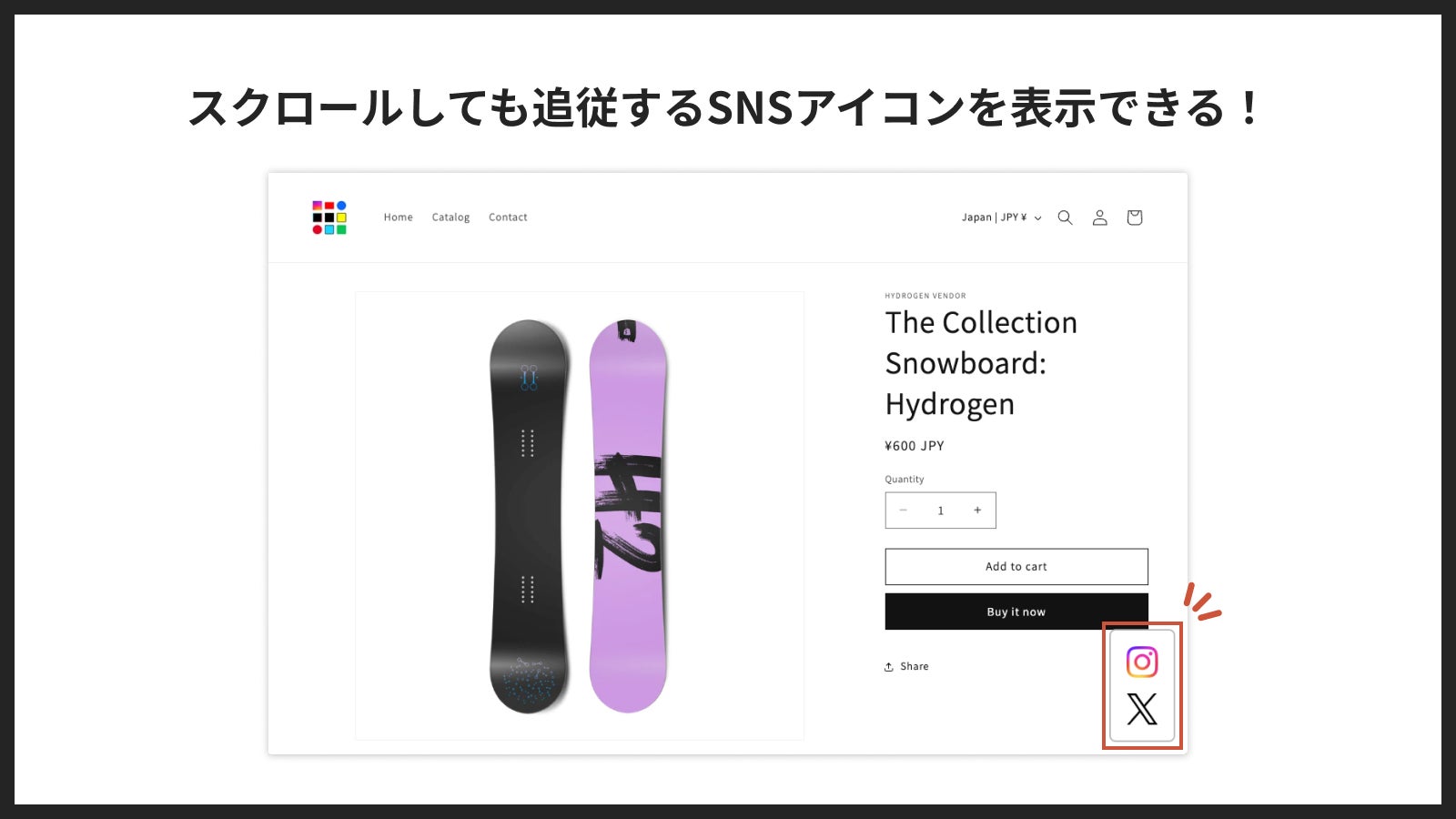 「シンプルSNS誘導|お手軽追従SNSアイコン」を使用すると、ストアの画面にスクロールしても追従する SNS アイコンを表示できます。アイコンをクリックすると、設定されている SNS アカウントのリンクが開かれます。