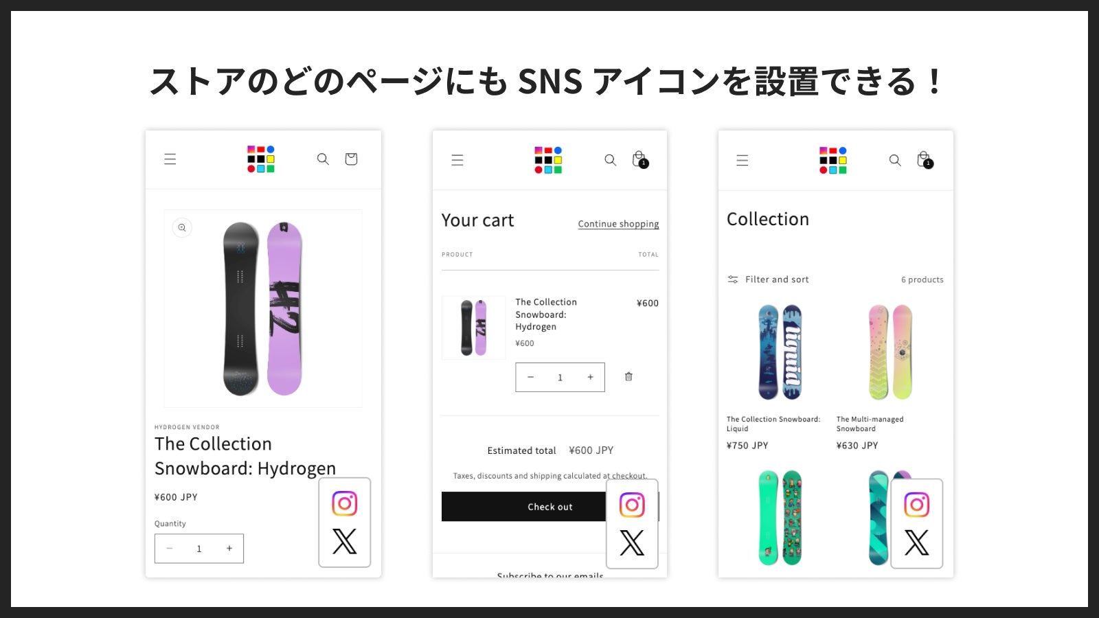 「シンプルSNS誘導|お手軽追従SNSアイコン」では、ストア上のすべてのページに SNS アイコンを表示できます。そのため、ストアに滞在するユーザーはどこからでも SNS にアクセスすることができます。