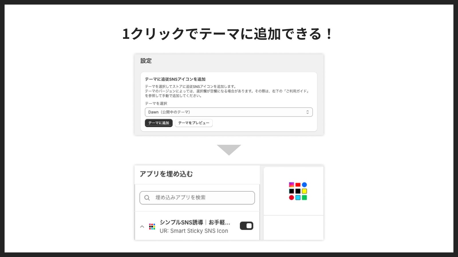 「シンプルSNS誘導|お手軽追従SNSアイコン」では、SNS アイコンを表示するためのアプリブロックを1クリックでテーマに追加できます。難しい操作は必要なく、誰でも簡単にアプリを始められます。