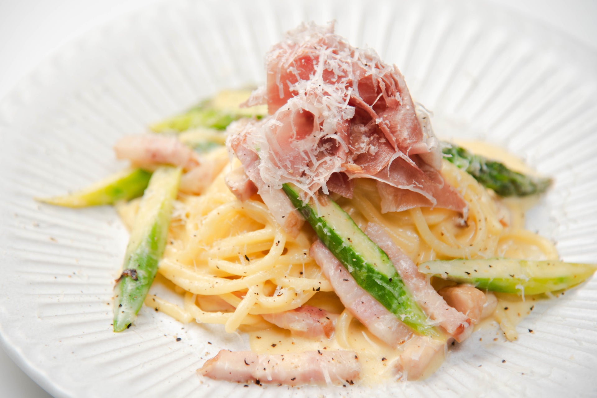 ハモンセラーノの生ハムとアスパラガスのカルボナーラ