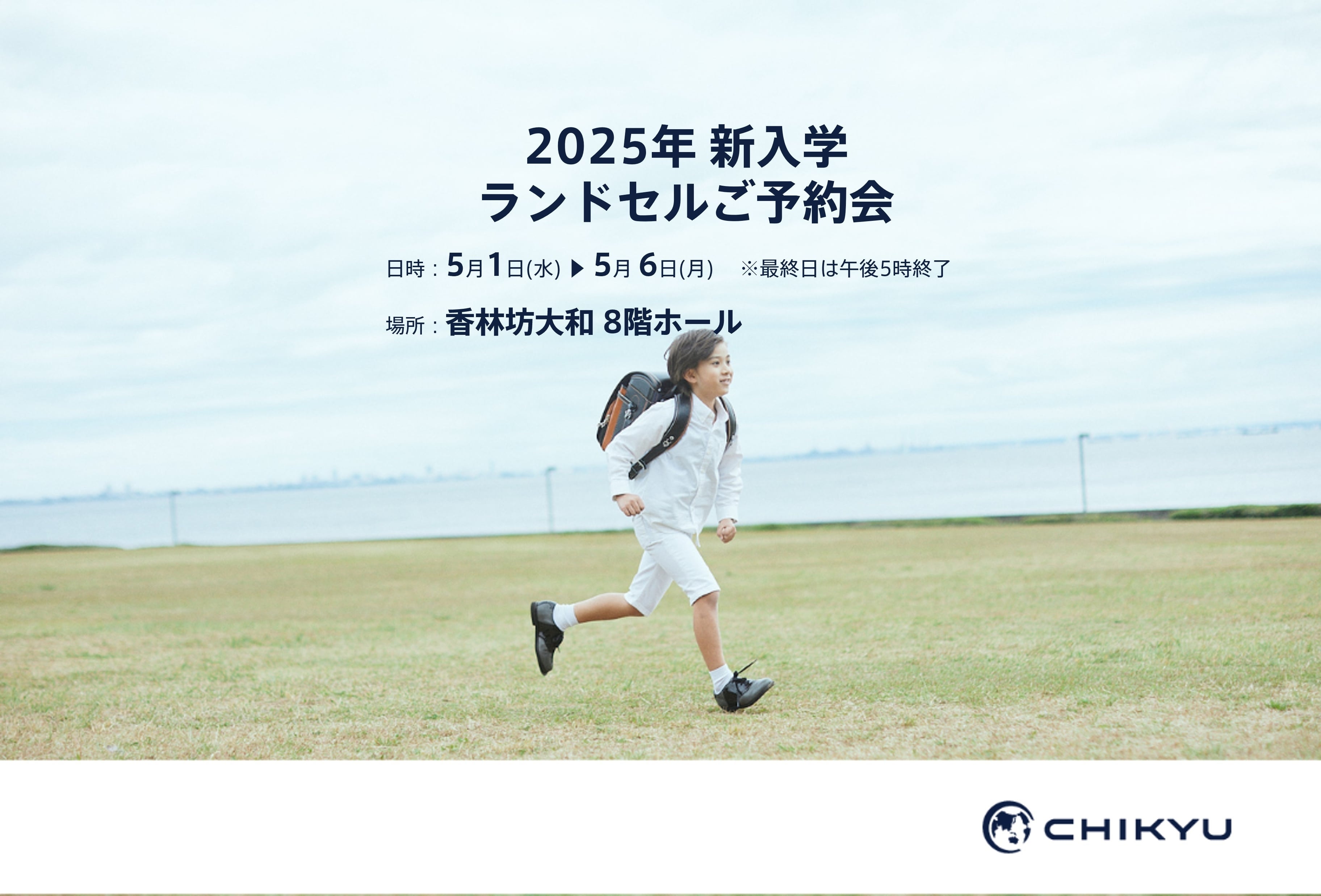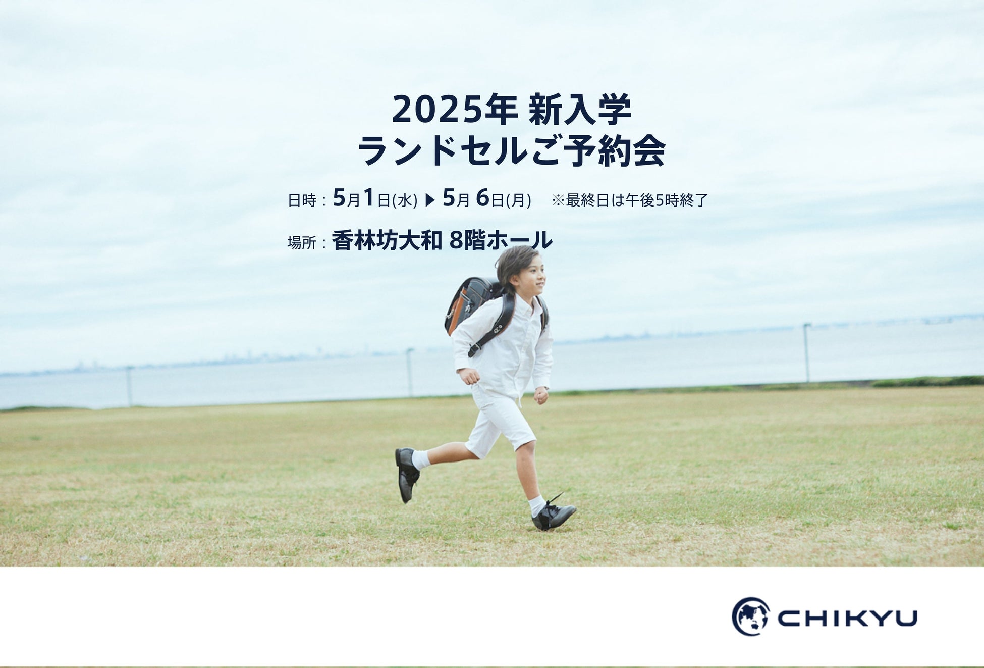 ランドセルの企画・販売を行うCHIKYU株式会社(旧池田地球株式会社、東京都港区、代表取締役:村尾光一)は、石川・大和香林坊店「2025年 新入学ランドセルご予約会」に参加いたします。
