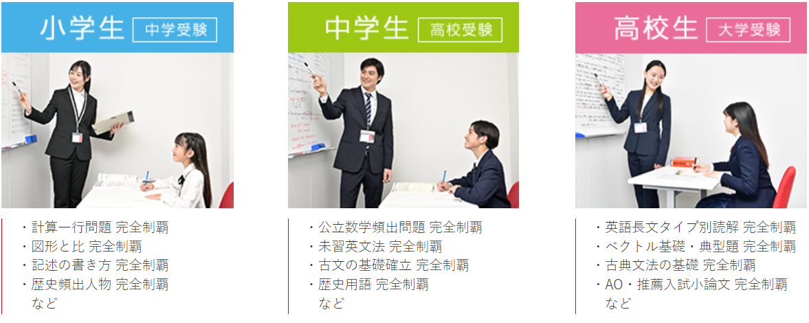 生徒が本当に行きたいと思っている志望校合格に向けて必要なことを、ムリ・ムダなく学ぶために、講師が「合格逆算カリキュラム」を作成し、完全1対1であなただけのための授業を実施いたします。