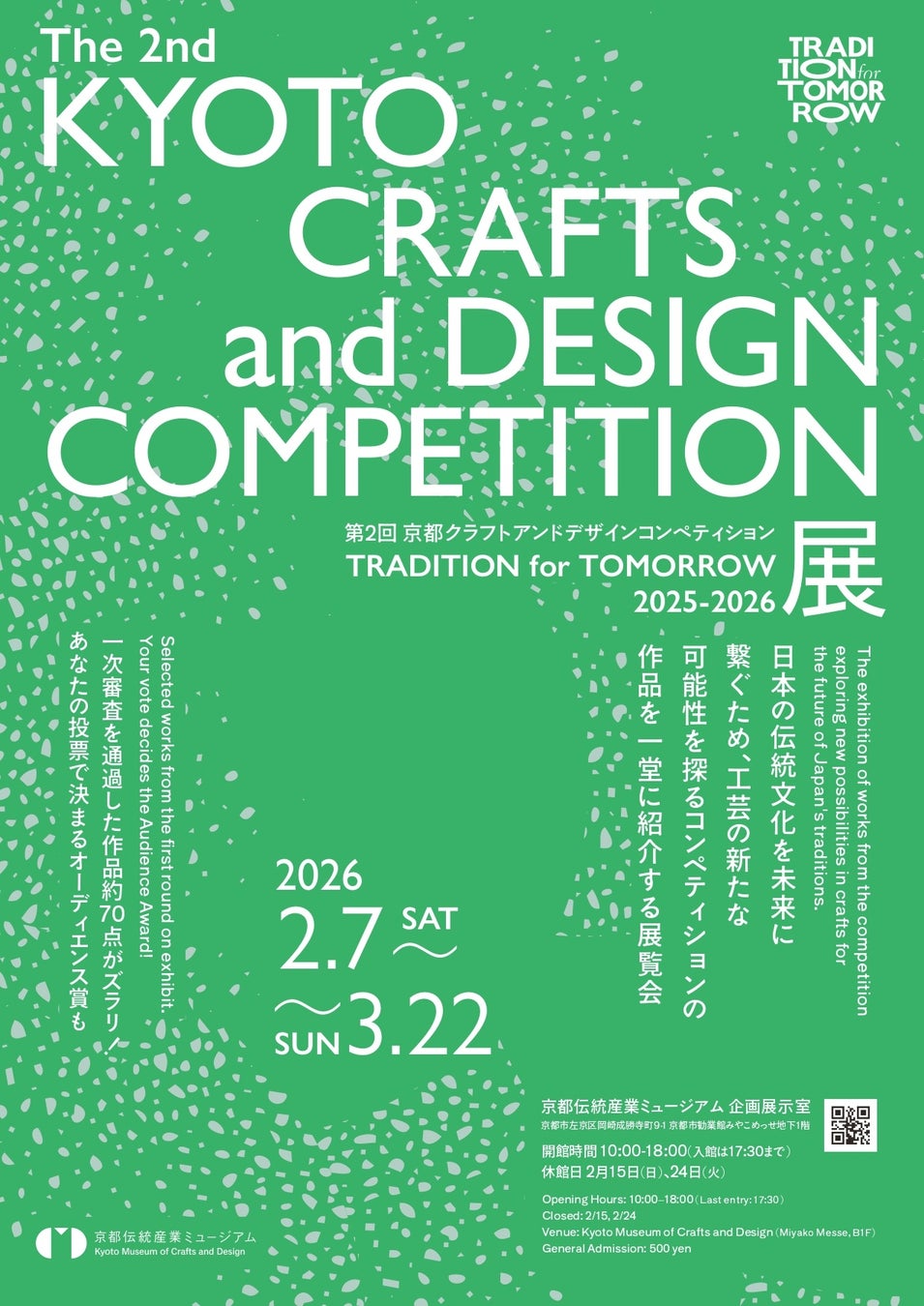 京都伝統産業ミュージアム(京都市左京区)では、2026年2月7日(土)から3月22日(日)まで、第2回 京都クラフトアンドデザインコンペティション「TRADITION for TOMORROW」展を開催します。本展は、京都の伝統産業が育んできたものづくりを未来へつなぐことを目的としたコンペティションの入選作品を紹介する展覧会です。