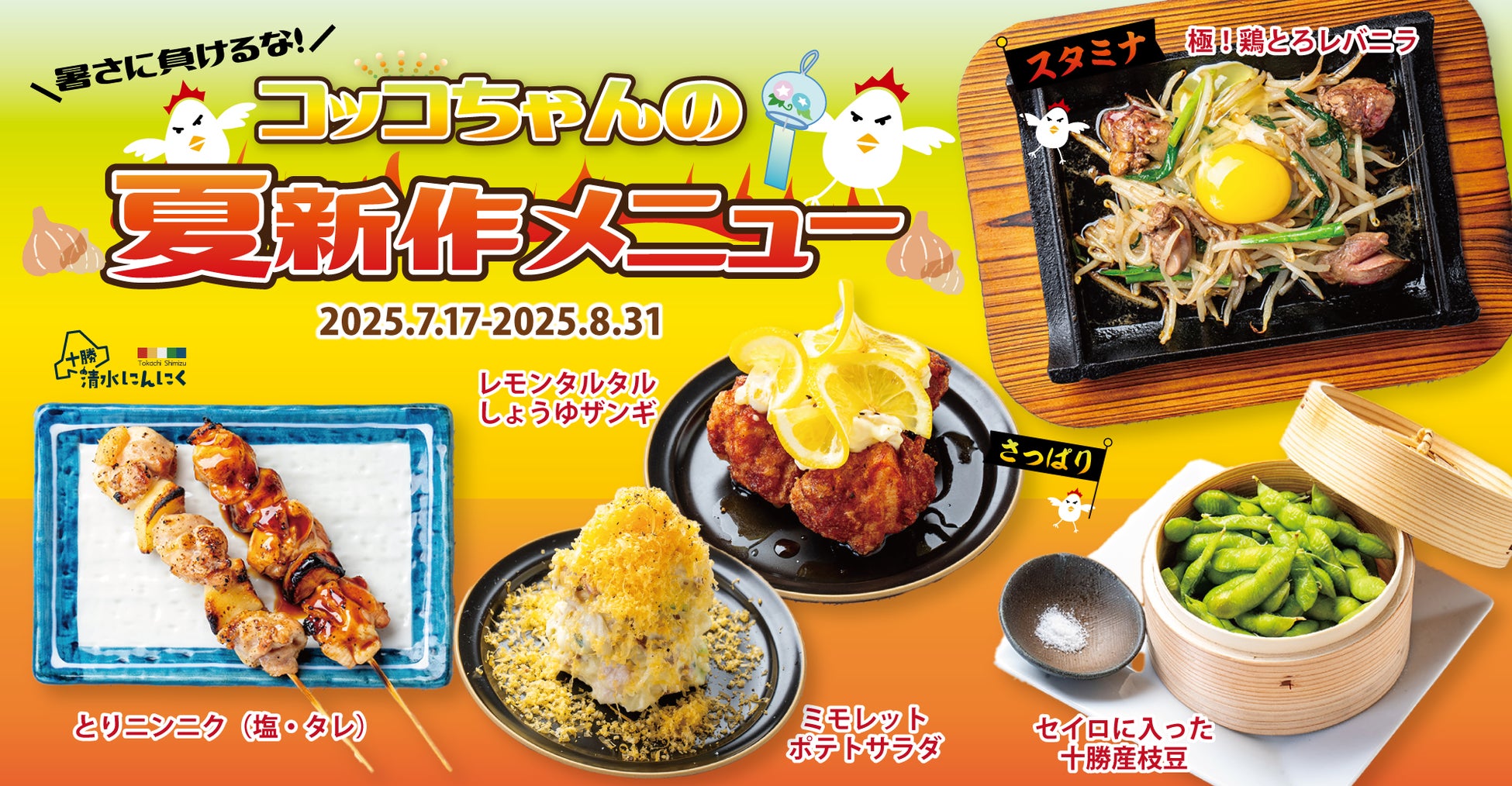 札幌を拠点に東北・関東で「北海道イタリアン ミアボッカ」「北海道小麦の生パスタ 麦と卵」などの飲食店を45店舗展開する株式会社イーストン(本社:北海道札幌市、代表取締役社長 大山泰正)は、焼鳥業態『焼鳥ダイニング いただきコッコちゃん』全店にて2025年7月17日(木)から2025年8月31日(日)の期間「夏限定メニュー」を販売いたします。