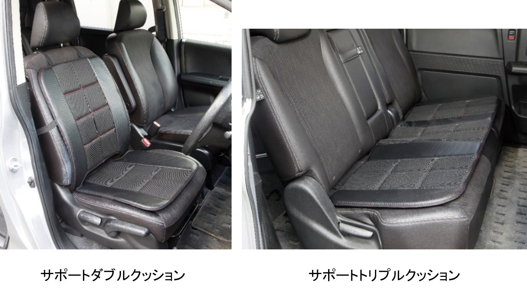 サポートダブルクッション:座面から背面までをカバーすることで、運転中の体の負担を軽減するサポートクッション。