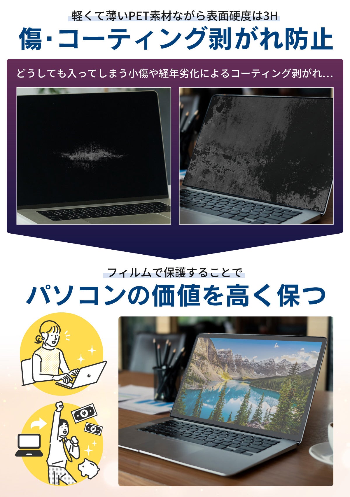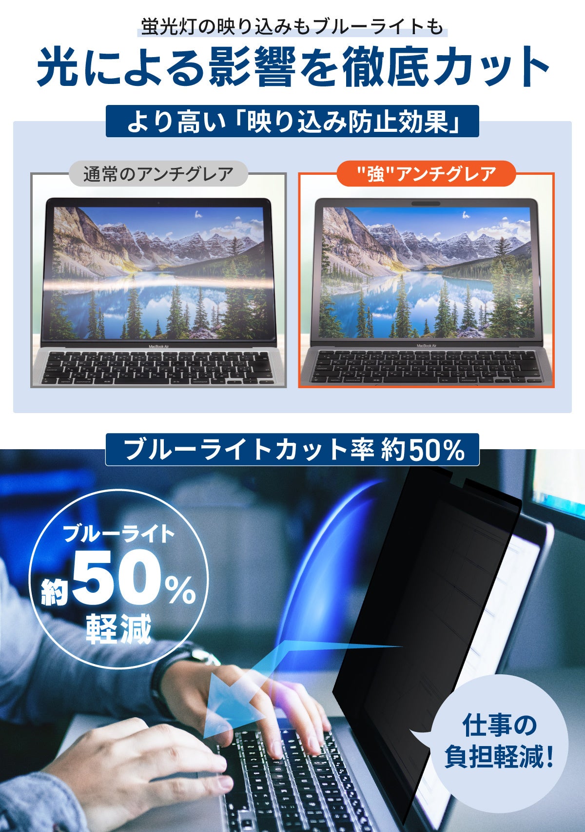 マックブックエアーやマックブックプロの画面傷を防止して、リセール時まで価値を守る!通常のアンチグレア以上に映り込み防止効果を高めた反射防止フィルム。約50%のブルーライトカット、抗菌・抗ウィルス効果も