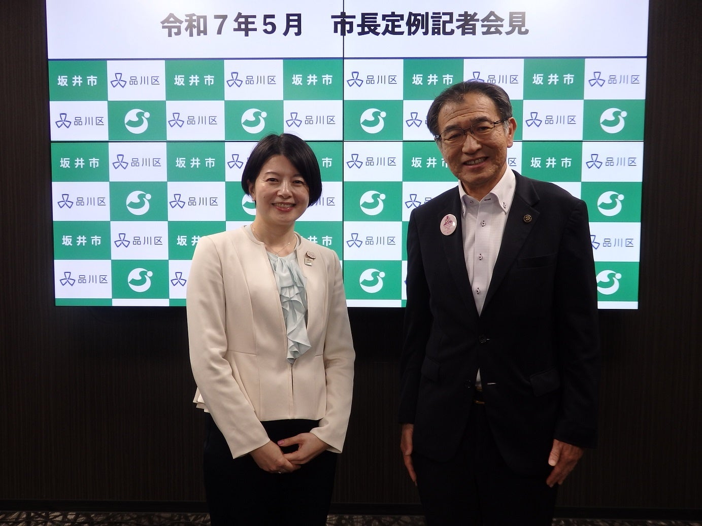 福井県坂井市と連携協定を結んでいる東京都品川区の森澤恭子区長が、5月28、29日の2日間、東尋坊や丸岡城など観光地を中心に、坂井市内を現地視察した。坂井市と品川区は2015(平成27)年から連携事業を始め、翌16(同28)年に品川区の戸越銀座商店街に「市アンテナショップ」を開店するなど10年余り交流を続けている。現職の品川区長が公式に、坂井市を訪れるのは初めて。29日に市役所で池田禎孝市長の会見に同席した森澤区長は「改めて、坂井市の現地に足を運んで、大変いいところだと思った。坂井市との市民と区民のさらなる取り組みを考えたい」と、これまで以上に両都市間のきずなを深めることを明言した。