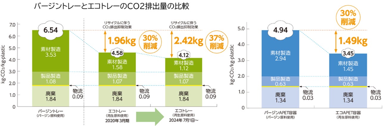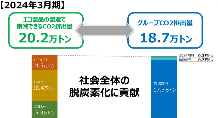 関東エリア、中部エリア、関西エリアの3つの生産・物流拠点において太陽光発電設備の設置・運転を行っています。2024年3月に関西工場での運転が開始したことにより、エコトレーのCO2削減効果は7月1日から37%となりました。”エコ製品”(エコトレー、エコAPET、エコOPET)を販売することで2024年3月期はサプライチェーン全体で約20.2万tのCO2削減効果がありました。