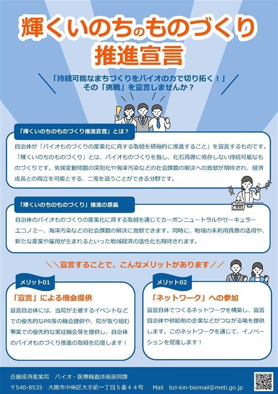 経済産業省 近畿経済産業局は、バイオものづくり製品・産業に係る機運醸成、需要拡大、産業振興等を図るため、自治体が自主的に取組を表明する新たな枠組み「輝くいのちのものづくり推進宣言」を創設しました。