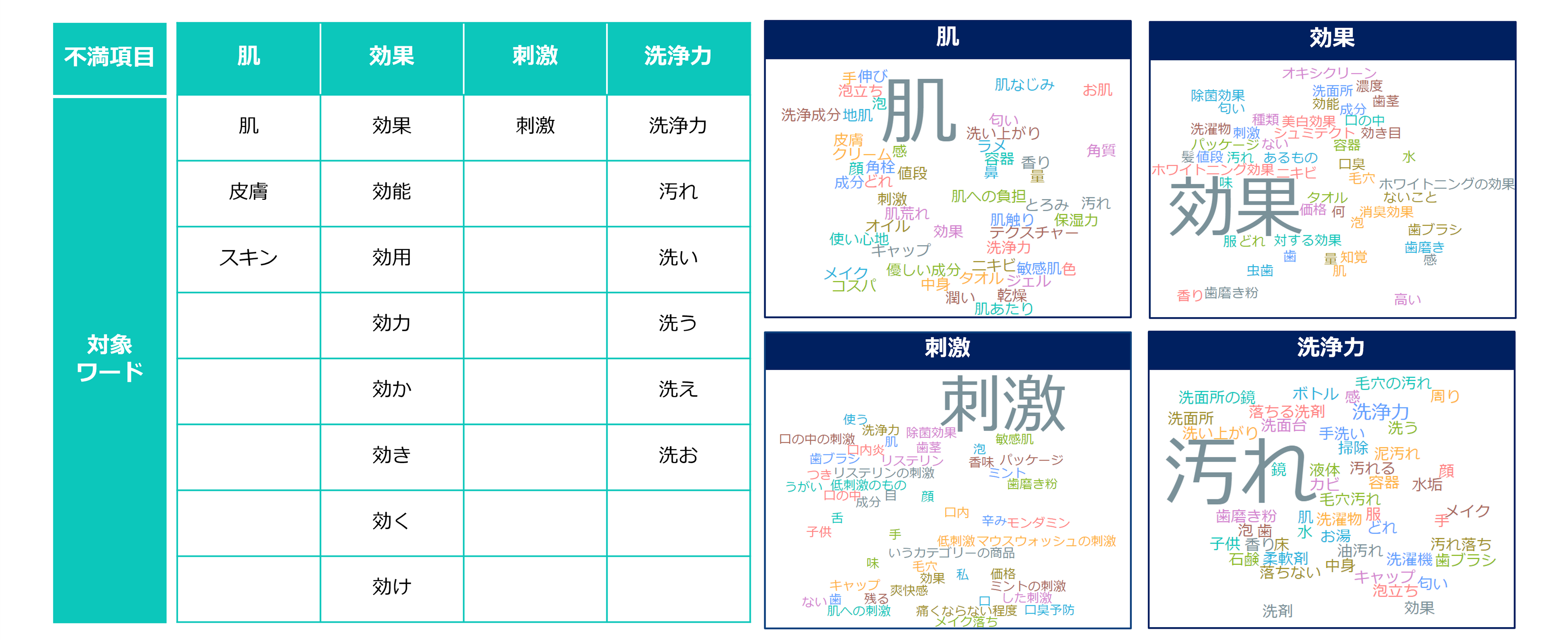 離反割合が特に高かった「肌」「効果」「刺激」「洗浄力」を対象に独自の辞書を設定した。 不満項目毎に優先課題図を作成し、それぞれの特徴的な課題を確認する。