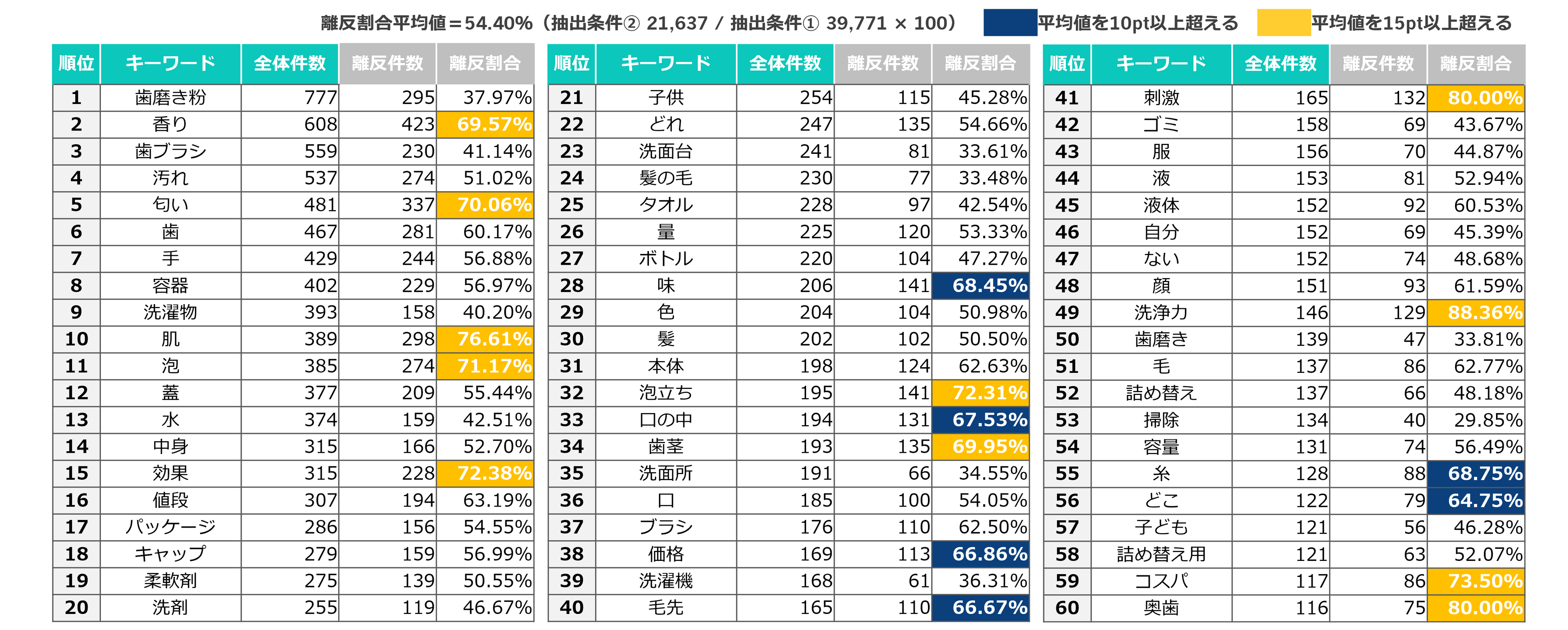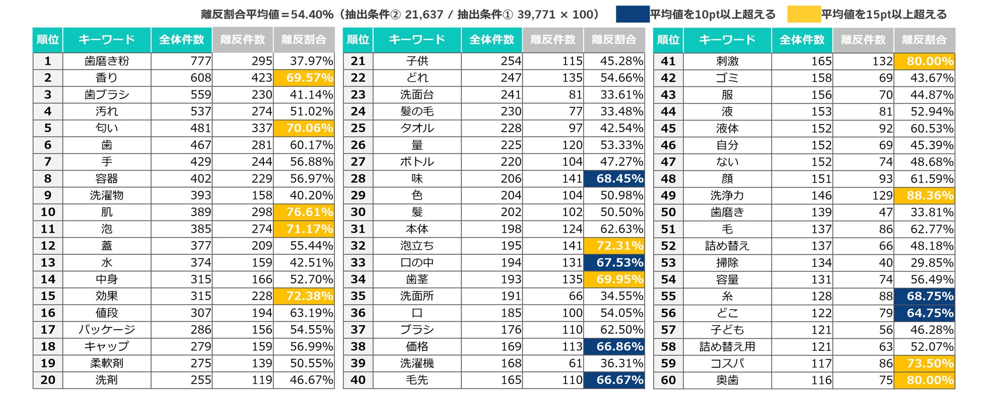 抽出条件①のキーワードランキングをベースに、全体件数に対するキーワード別の離反件数の割合を確認した。 「香り」「肌」「泡」「効果」「歯茎」「刺激」「洗浄力」「コスパ」「奥歯」といったキーワードが離反割合平均値を15pt以上上回る結果となった。