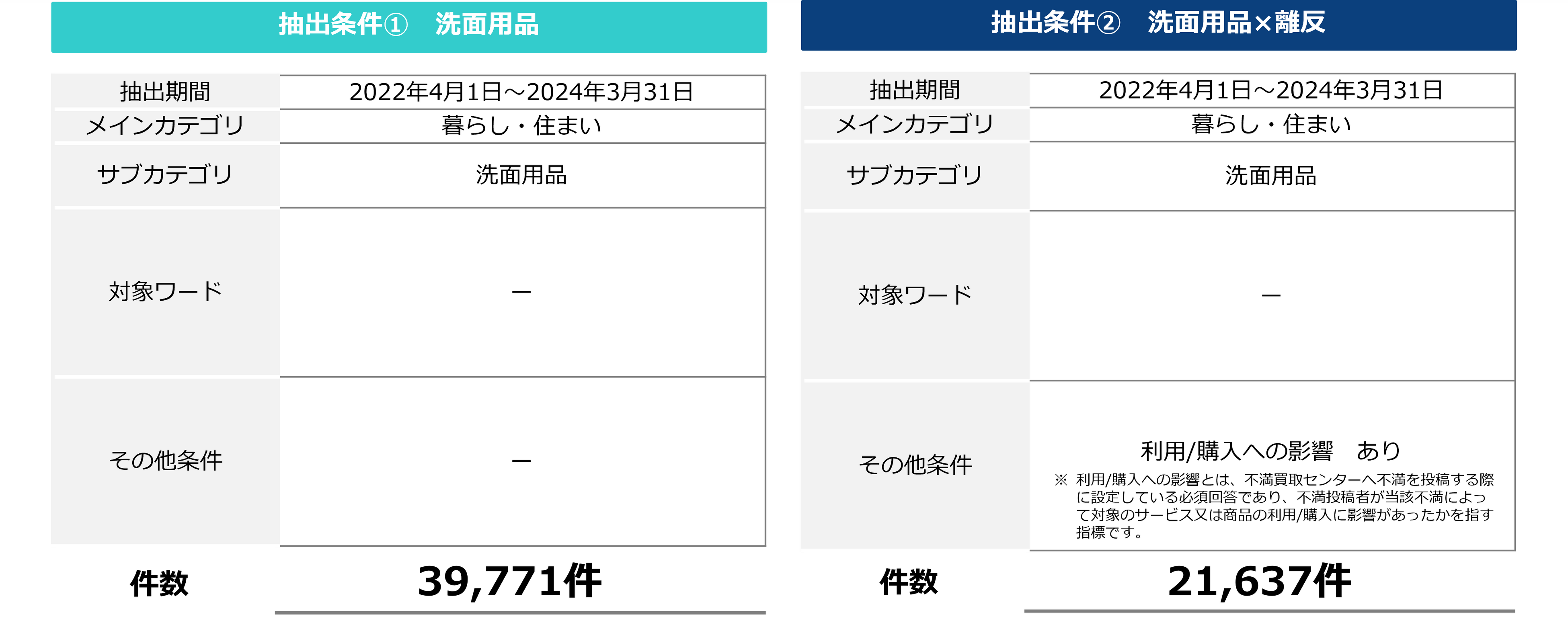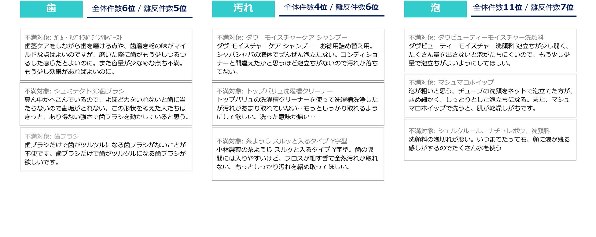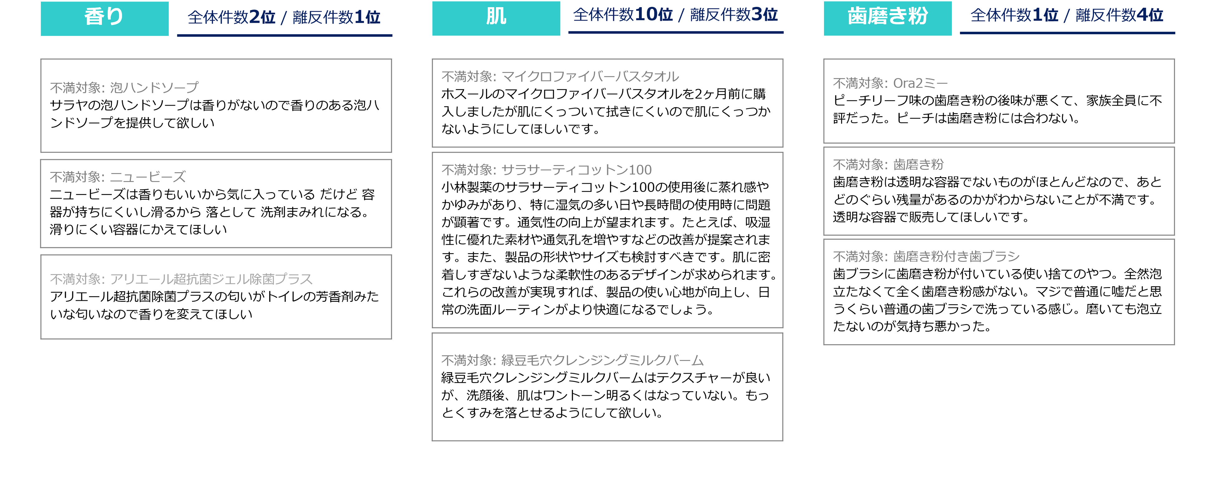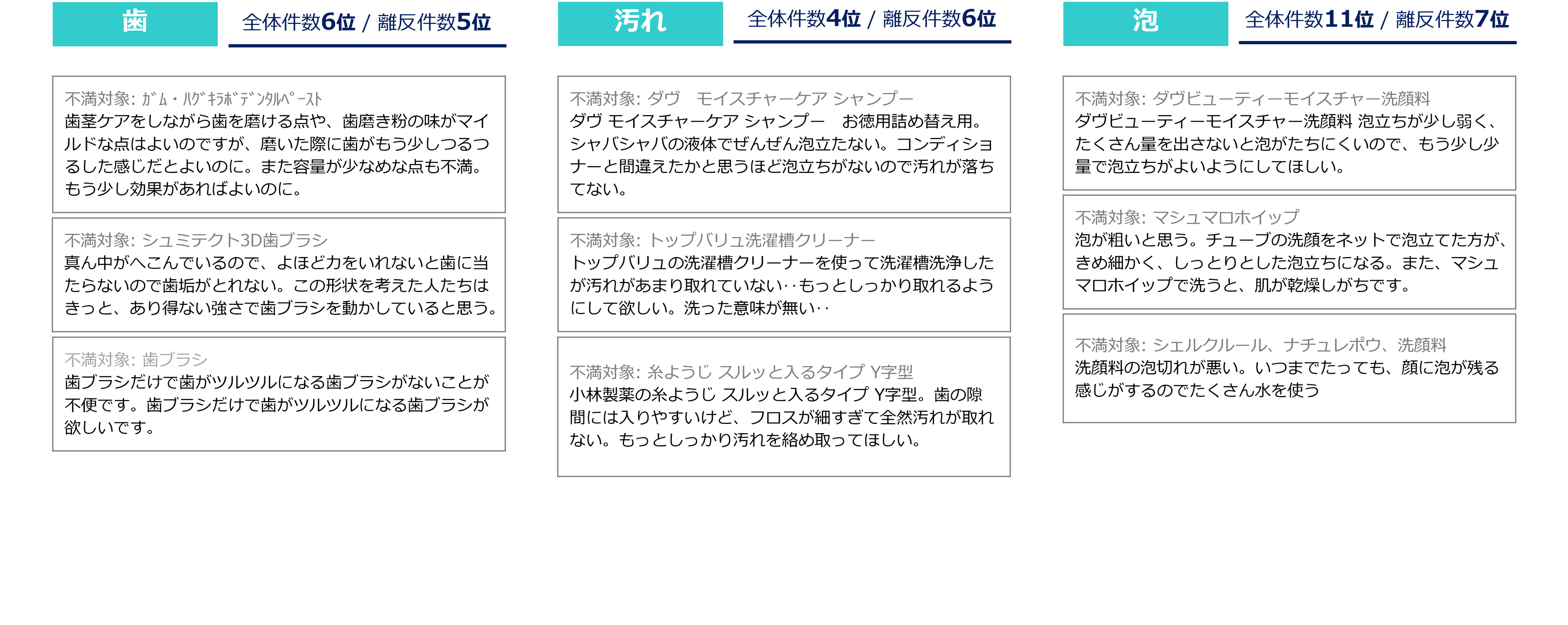 『不満ファインダー』のテキスト解析機能を用いて未充足割合が高いキーワードに関連する不満の原文を参照しながら、洗面用品に対して抱いている不安や不満の特徴を整理しました。