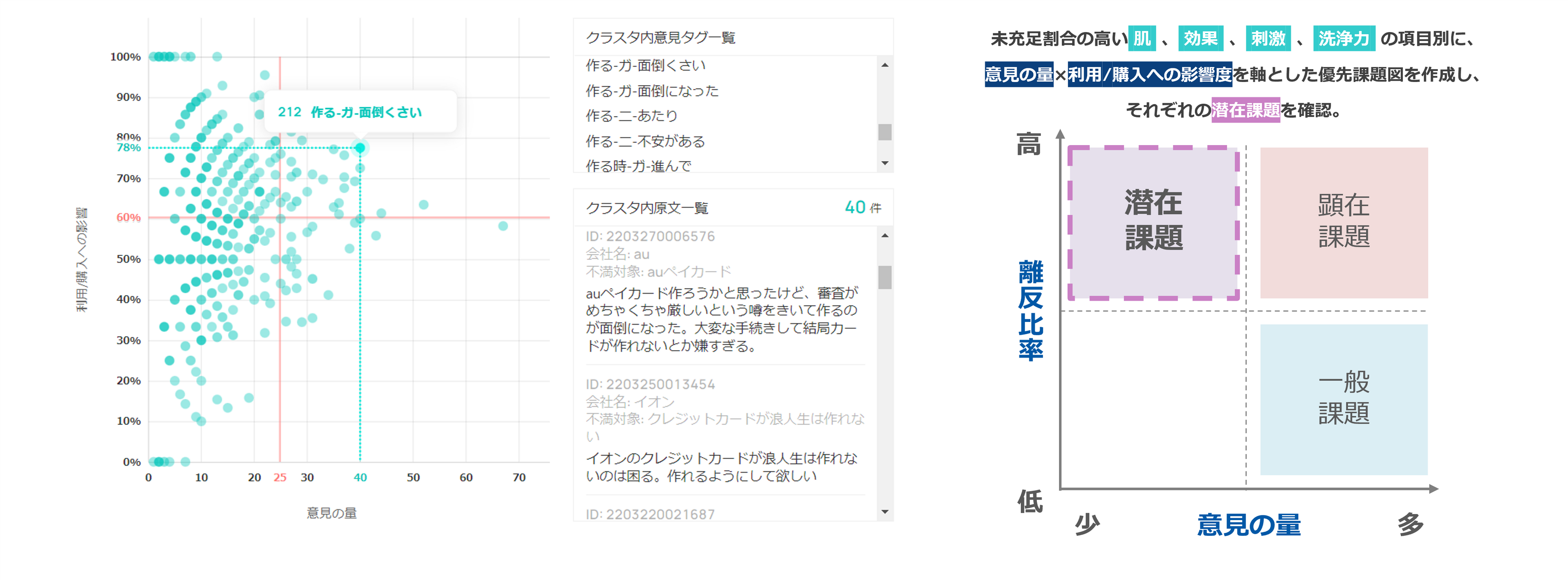 意見の “量” と “質(利用/購入への影響度)” から優先的に取り組むべき課題を特定する弊社独自のフレームワーク「優先課題図」によって、「肌」「効果」「刺激」「洗浄力」の項目別にプロットされた意見のクラスタを確認しながら、潜在課題を抽出します。