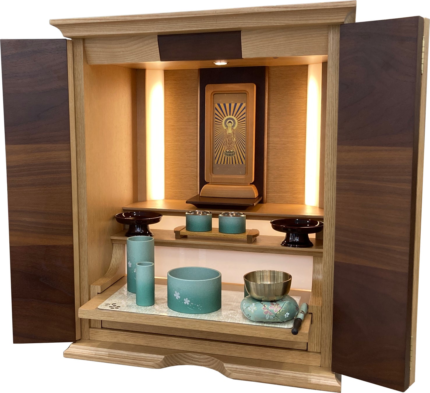 会津若松産の和モダン仏壇。ケヤキ材を使用し、戸板や高欄のデザインなど伝統の形を残しつつもモダンな造りとなっています。奥行きが25㎝と浅く置き場所を選びません。欄間と高欄には桜の蒔絵が施され、ライトをつけた際のシルエットが風雅な雰囲気です。