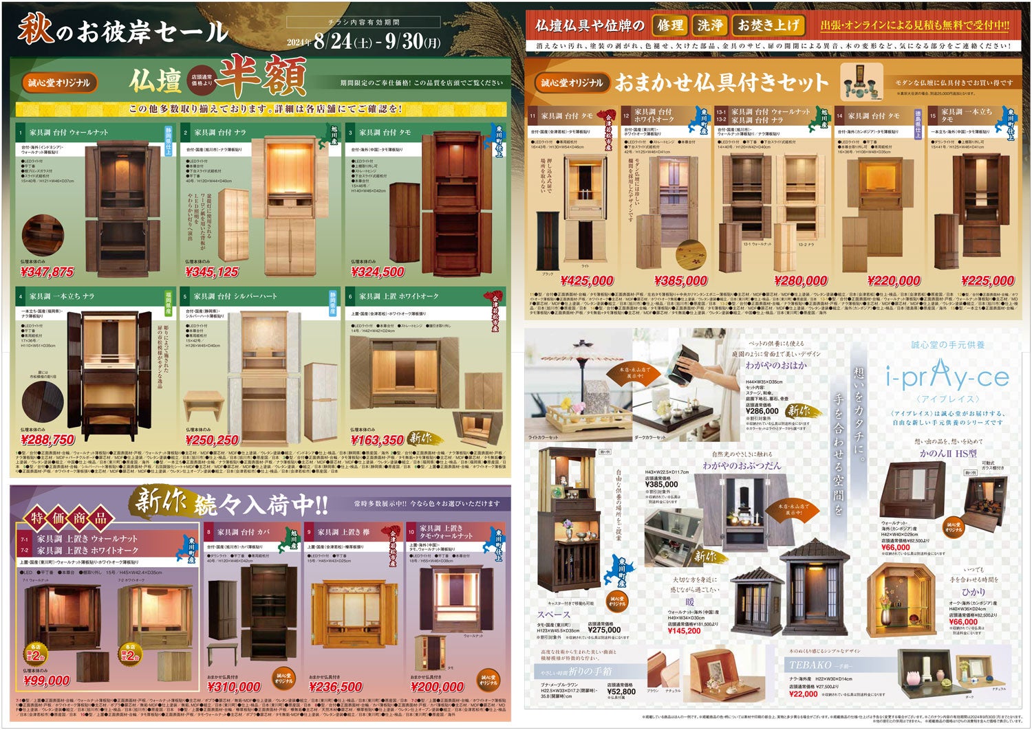 株式会社あいプラン(北海道札幌市)の仏壇・仏具を取り扱う誠心堂では、秋のお彼岸に向けておすすめの仏壇が最大70%などのお得なセールを開催。さらに新作仏壇やお彼岸のお参りアイテムなどもお得に販売。普段気になっていたお仏壇の修理やメンテナンスも承ります。