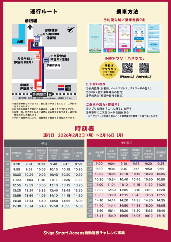 「彦根市彦根城ルート」において、以下のエリア・期間等で自動運転EVバスの実証運行を行います。