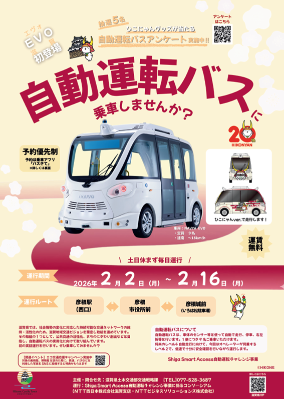 自動運転EVバスで世界をリードする株式会社マクニカ(代表取締役社長:原 一将、以下 マクニカ)とともに、滋賀県における「持続可能な地域交通ネットワークの維持・活性化」等の地域課題の解決に向け、2026 年 1 月 31 日(土)から 2 月 16 日(月)までの 17日間、彦根市内にて初の自動運転EVバスの実証事業を行います。
