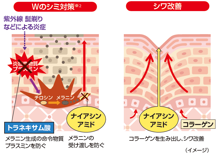 日本初※1、「トラネキサム酸」と「ナイアシンアミド」によるWのシミ対策※2成分を配合。「トラネキサム酸」はメラニン生成の命令物質であるプラスミンを防ぎ、「ナイアシンアミド」はメラニンの受け渡しを防ぐことで2つのシミ生成ポイントへアプローチします。