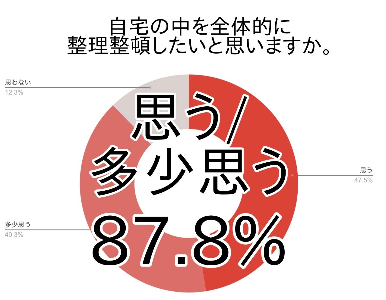 アンケートでは、自宅の中を全体的に整理整頓したいと思う/多少思うと答えた方は約9割(全国91.0%・関東87.8%)でした。