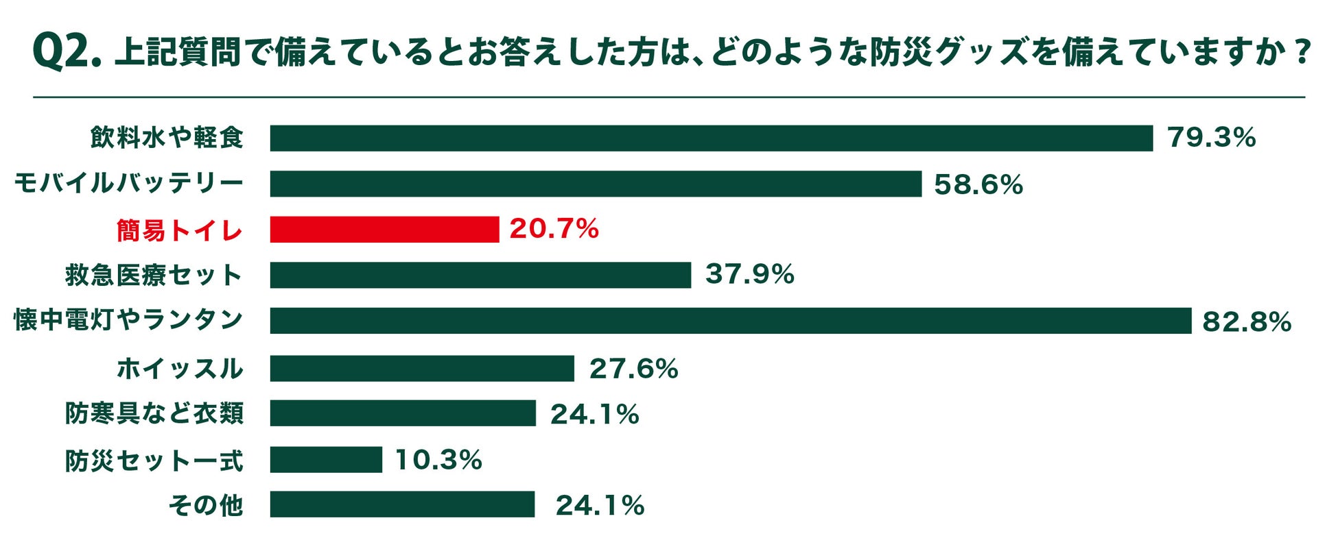 TOPIC②|懐中電灯や水の備蓄率は8割と高い備蓄率に達する中、簡易トイレは2割程度とアイテムにより差が明らかに