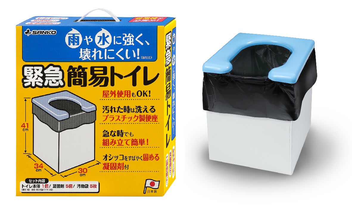 素材 |便座:ポリプロピレン、本体:紙、脚キャップ:ポリエチレン、凝固剤:高分子ポリマー、汚物袋:ポリエチレン、簡易ポンチョ:ポリエチレン