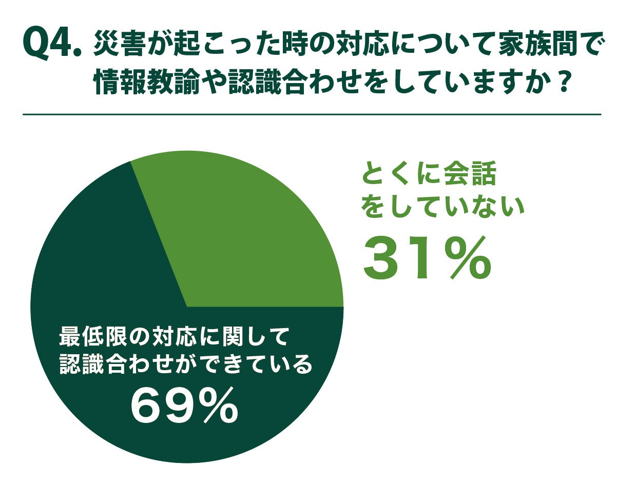 災害が発生した際の対応について、家族で最低限の対応に関して認識合わせができている方は、約70%に上りました。一方で、特に会話をしていない方は約30%と家族間のコミュニケーションにおいては、防災用品の備蓄率(約90%)を下回り、改善の余地があることがわかります。また、対応や手順に関して詳細まですり合わせができている方は0%であったため、台風や地震など災害が増える中で、避難ルートの再確認や防災用品の配置や使用手順をクリアにするなど、更なる防災力の向上を図る必要があります。