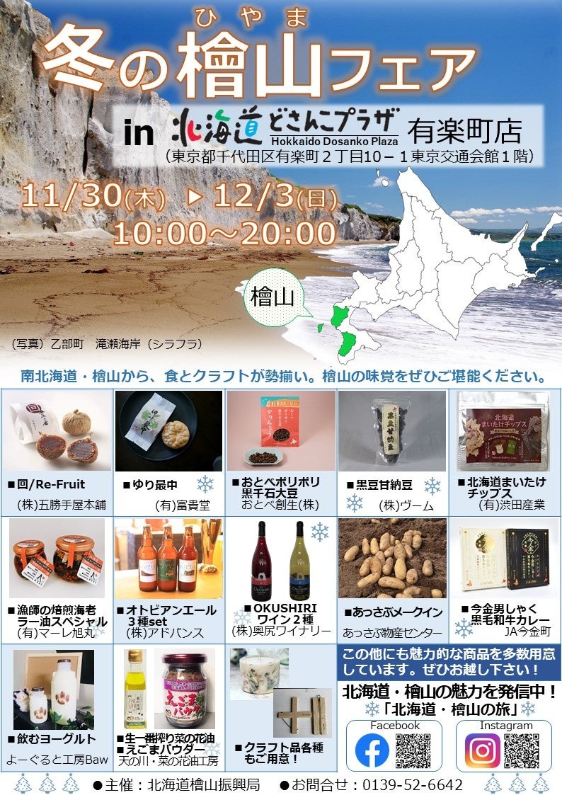 北海道檜山振興局では、管内の地域産品の認知度向上及び販路拡大を図るため、道の公式アンテナショップ「北海道どさんこプラザ有楽町店」において、冬の檜山フェアを開催します。