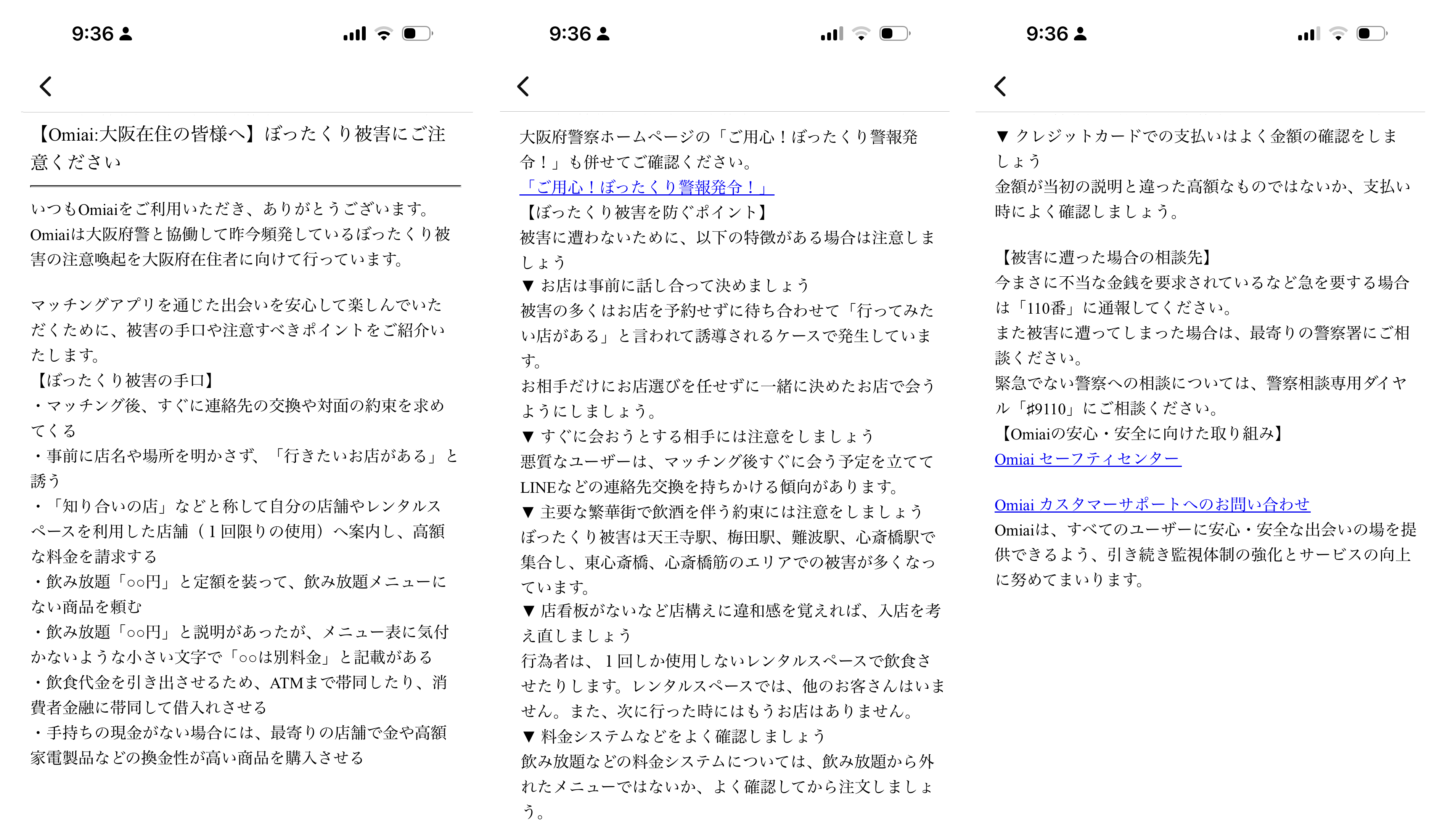 今回、大阪府警察と連携し、地域のユーザーの皆さまに対して注意喚起を実施できたことは、『ぼったくり被害』の未然防止に向けた重要な取り組みであると考えています。