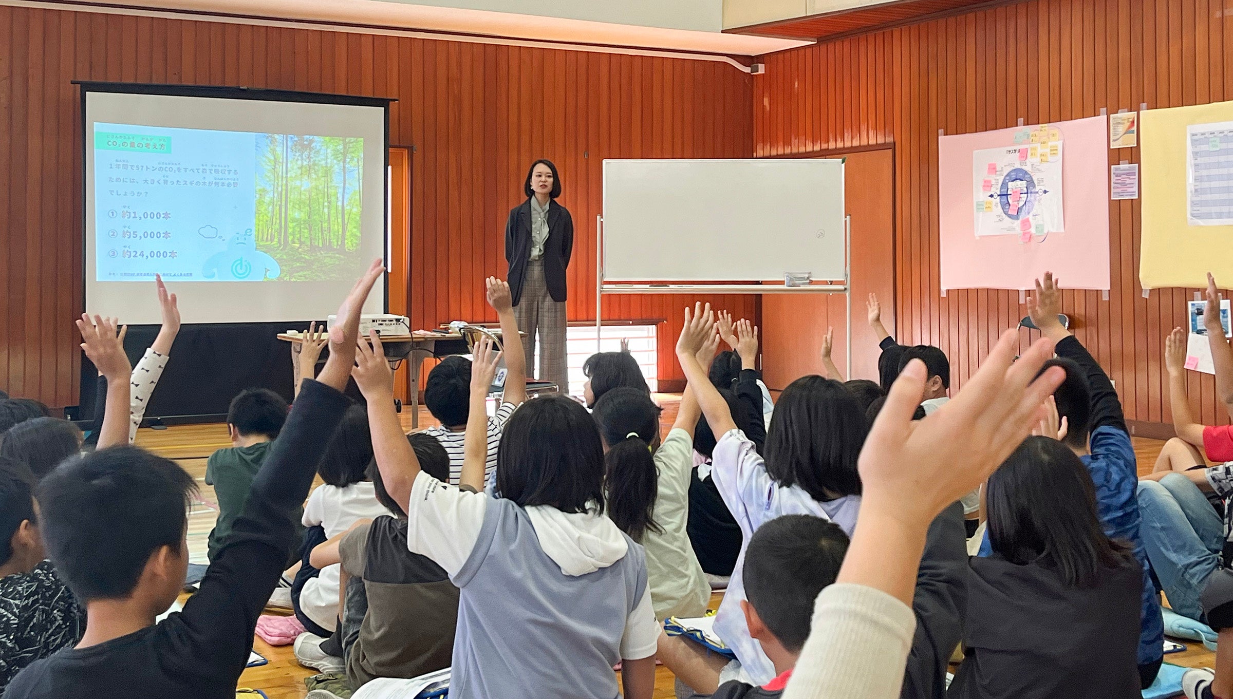 質疑応答では、児童から「CO2を1番吸う木の種類は何ですか」「木はどこからCO2を吸収しているのですか」などという質問が寄せられたほか、「CO2を吸収するためにはすごく多くの土地が必要だと分かった」「CO2は一度出してしまうと処理が大変だと思った」という感想も発表されました。