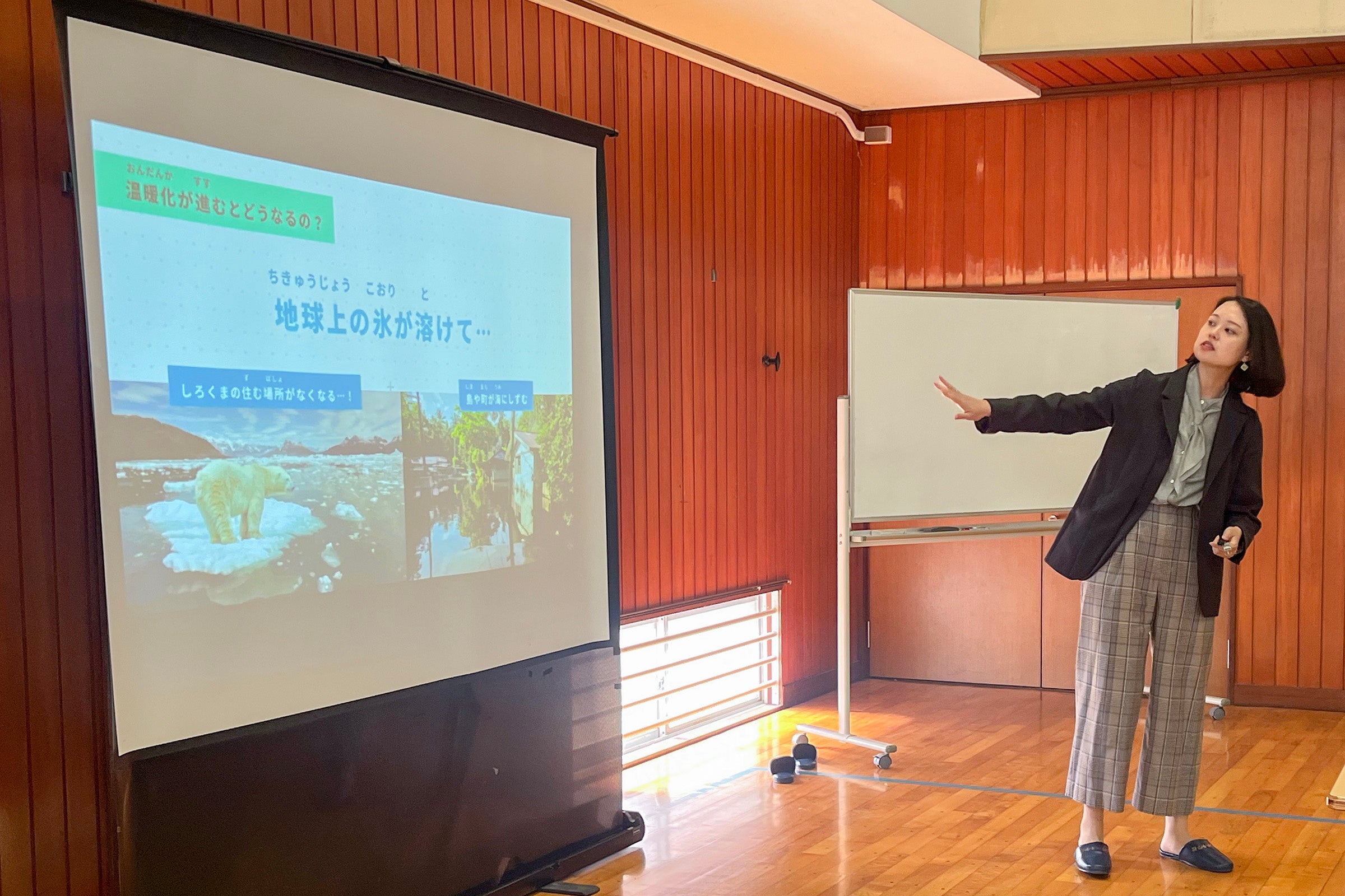 テーマは「地球温暖化の原因CO2について考えてみよう」。講師は、セールス&マーケティング部の甲斐綾乃が務めました。