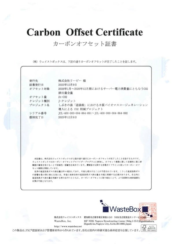 株式会社リーピー(本社:岐阜県岐阜市、代表取締役:川口聡、以下:当社)は、2026年1月から12月にかけて当社が運営管理するお客様のWebサイトのサーバー電力消費に伴い排出されるCO2の全量(推計2t-CO2)について、J-クレジット制度を活用したカーボン・オフセットを実施したことをお知らせします。温室効果ガス削減への取り組みを一層加速させます。