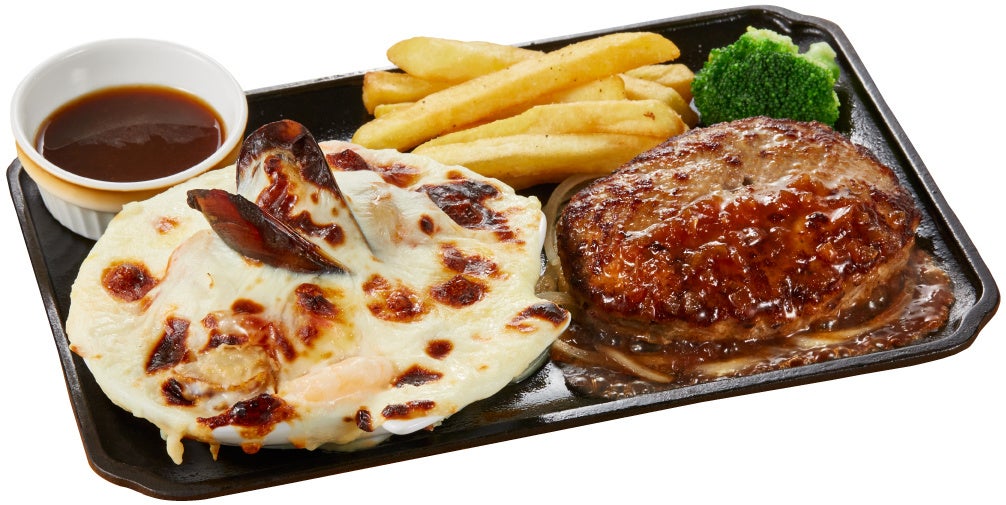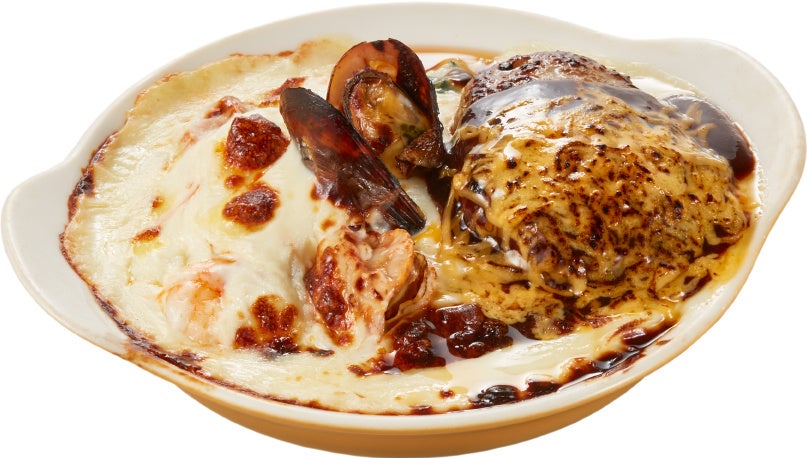 さらに、魚介たっぷりのドリアに“手ごね合挽きハンバーグ”をのせた「冬の熱々シーフードドリア~直火焼きチーズハンバーグをのせて~」も登場します。レッドチェダーチーズをかけバーナーで豪快に炙ったドリアは、ハンバーグの溢れる肉汁とまろやかなベシャメルソース、濃厚なチーズが相性抜群の一品です。