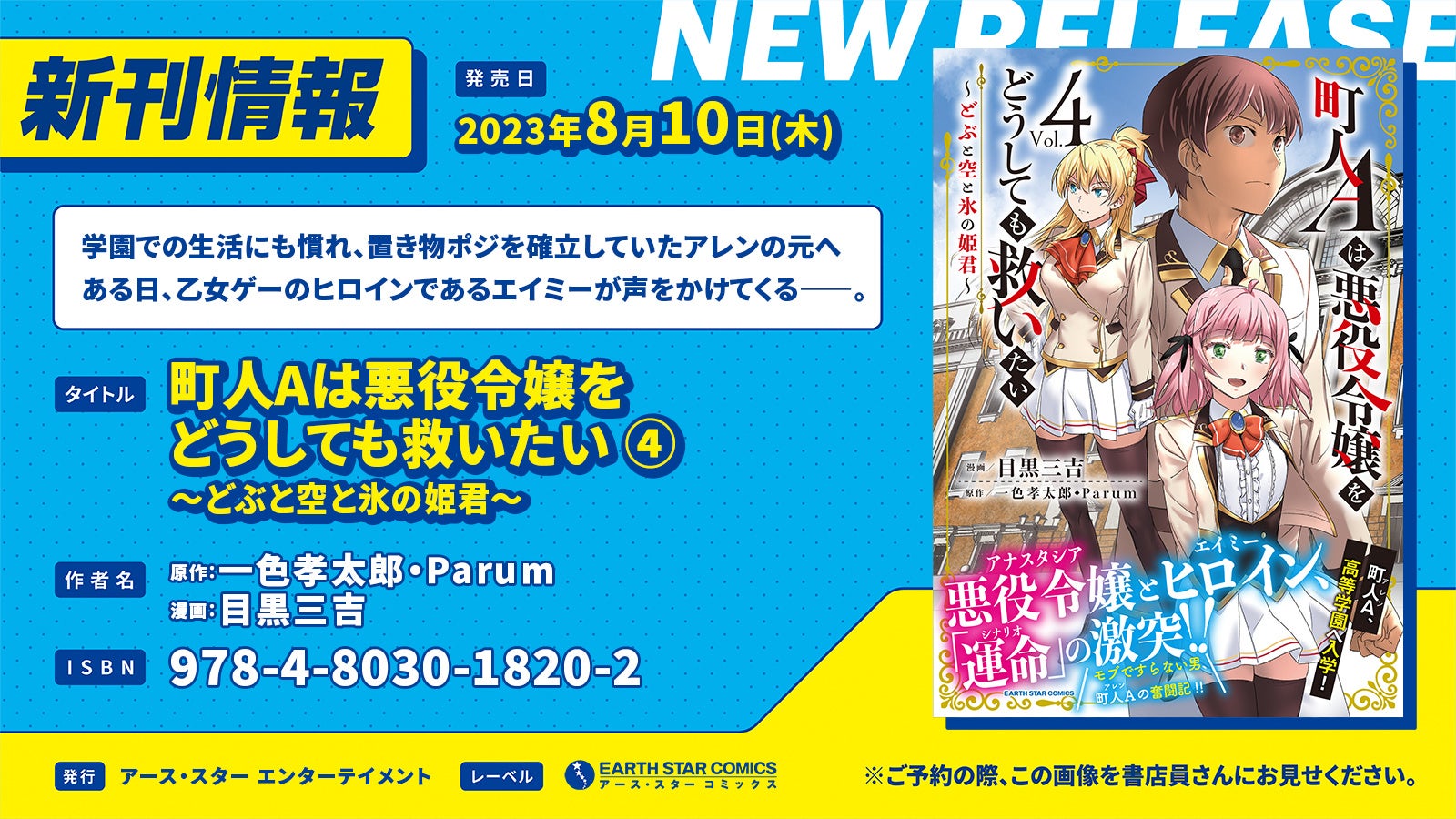 アース・スターノベルにて刊行中のノベルが原作で、現在コミック アース・スター公式サイトにて連載中の人気作品『町人Aは悪役令嬢をどうしても救いたい ~どぶと空と氷の姫君~』(原作:一色孝太郎・Parum 漫画:目黒三吉)第4巻を8月10日(木)に発売いたします。