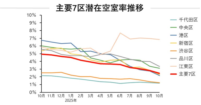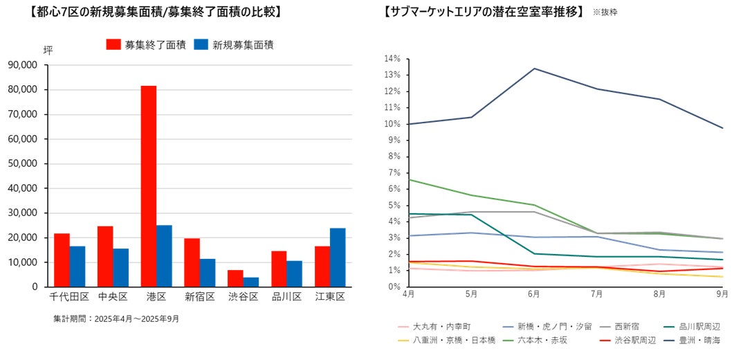 2025年度上半期は、募集終了面積が新規募集面積を上回り空室消化が進んだことで、都心7区の潜在空室率は低下した。都心7区の中では、豊洲・晴海エリアで大型の新築ビルが供給されたことなどが影響し、江東区のみ潜在空室率が上昇(4月:4.90%→9月:6.96%、+2.06pt)した。