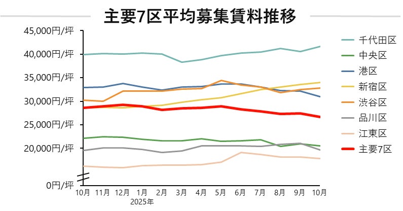 主要7区の平均募集賃料は26,642円/坪で前月比-751円/坪。