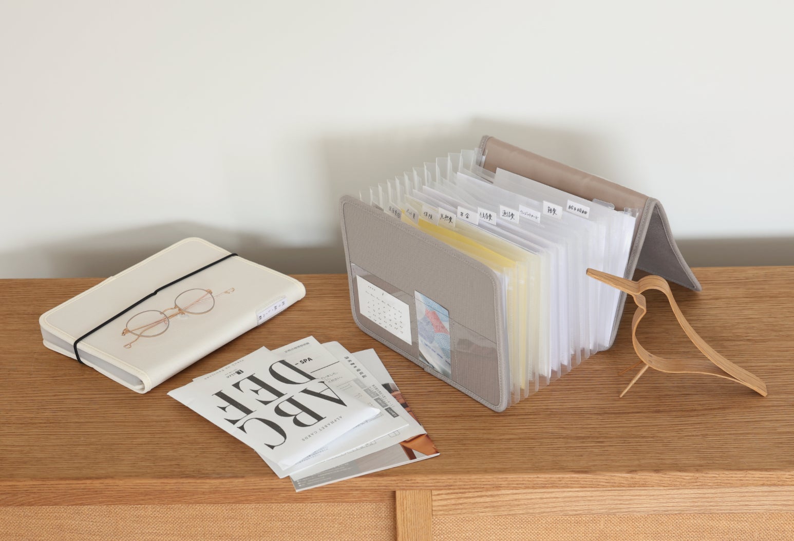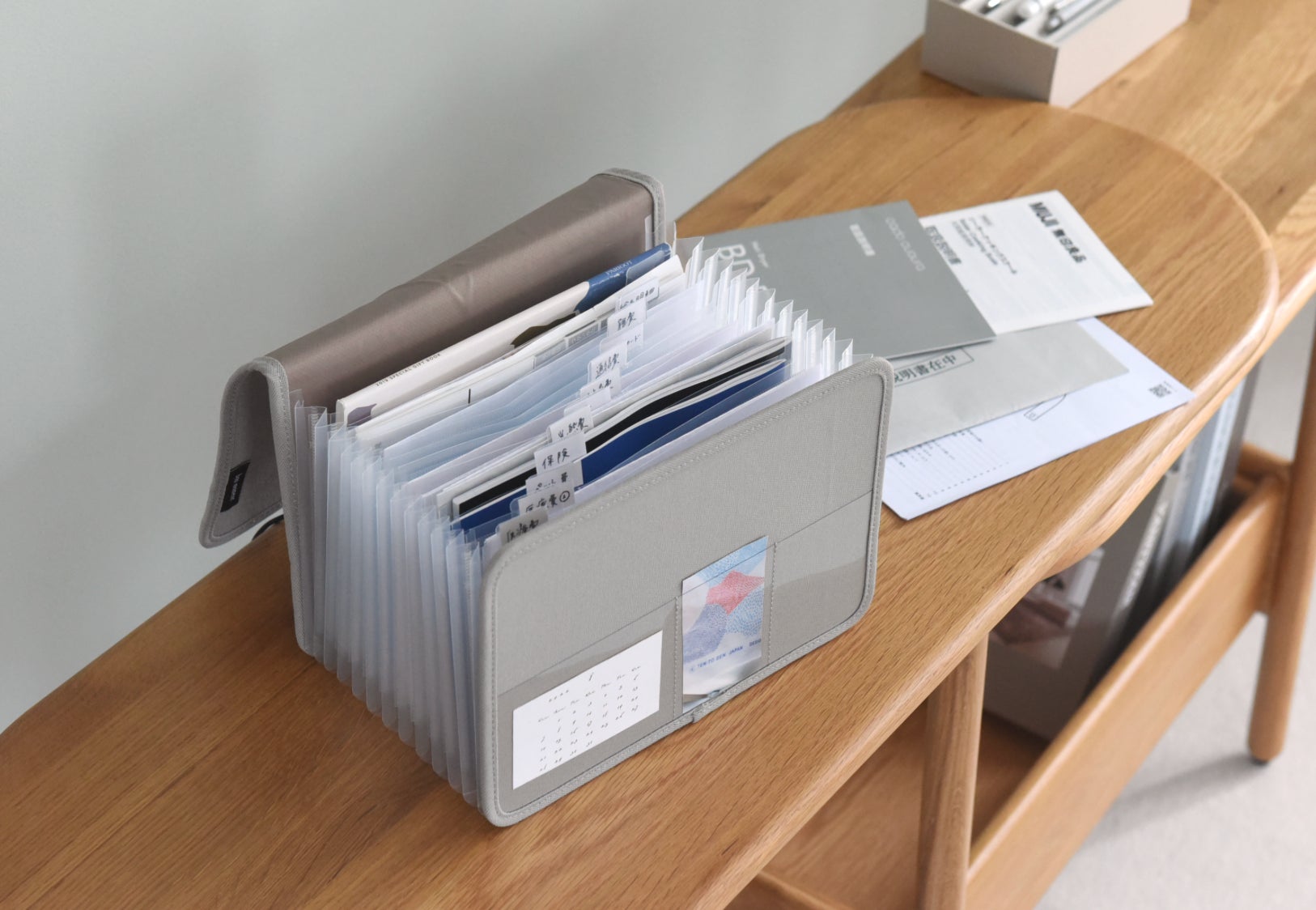 ガバッと開いて出し入れしやすいジャバラ型の「bon moment 書類収納ケース」。従来のS・Lサイズに加え、新たにMサイズが仲間入り!病院の領収書や子どもの学習塾プリントにぴったりのA5サイズです。