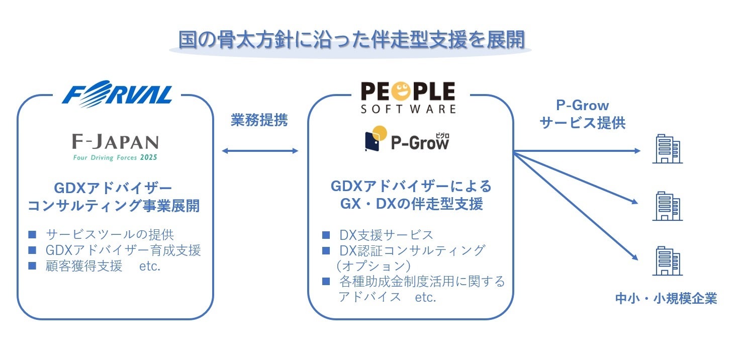 今回の業務提携はフォーバルが推奨する「F-Japan」構想に基づく取り組みのうち、中小・小規模企業に向けた伴走型支援サービスを主としています。フォーバルが「中小・小規模企業のGDX化促進に必要不可欠な独自サービスとツール」を提供し、ピープルソフトウェアが自社の持つノウハウと融合させることで、GDXアドバイザー事業「P-Grow(ピグロ)」を立ち上げました。当事業を国の方針と連動した新たな事業モデルとして確立させ、GDX人材の育成ならびにGDXアドバイザーによる伴走型支援が全国の中小・小規模企業になくてはならない存在となるよう展開させることを目的としています。