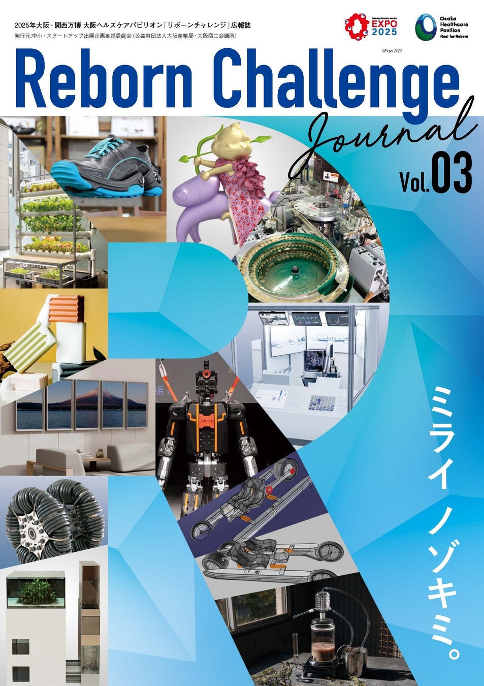 中小・スタートアップ出展企画推進委員会(公益財団法人大阪産業局・大阪商工会議所共同設置/委員長=立野純三・公益財団法人大阪産業局理事長・大阪商工会議所副会頭)は、2025年7月7日(月)、2025年大阪・関西万博の大阪ヘルスケアパビリオン内「リボーンチャレンジ」における展示物を紹介する広報紙『Reborn Challenge Journal』Vol.03を発行しました。