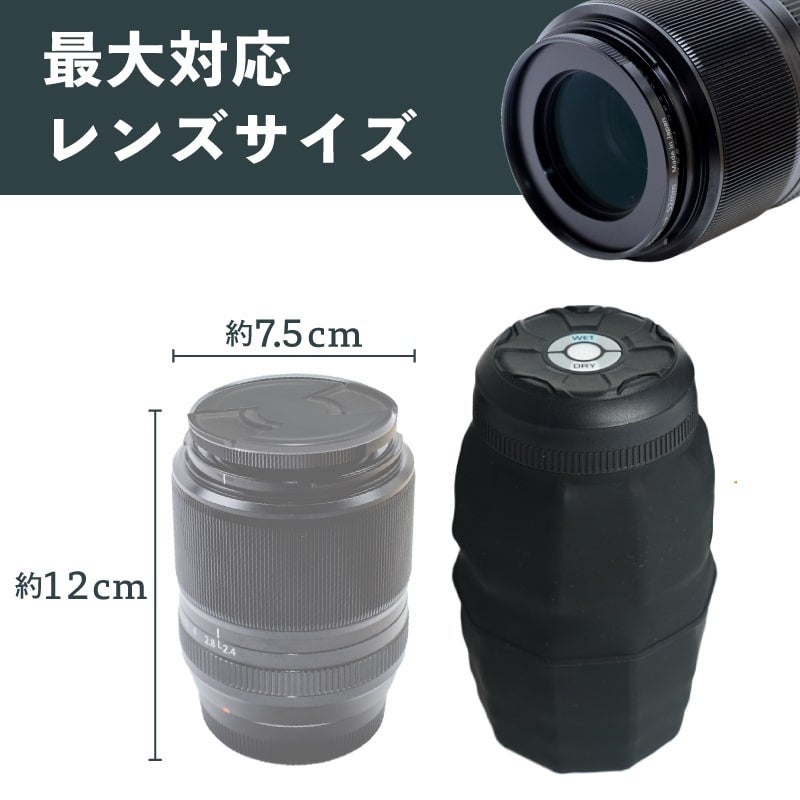 シリコン素材で伸縮性があり様々なレンズのサイズに対応。最大対応レンズサイズは直径7.5×長さ12cm。上部分と下部分の2枚のカバーをレンズにかぶせて使用。カメラにレンズを装着した状態のまま上部分をかぶせて使用することも可能。シリコン素材のカバーで傷も防止します。