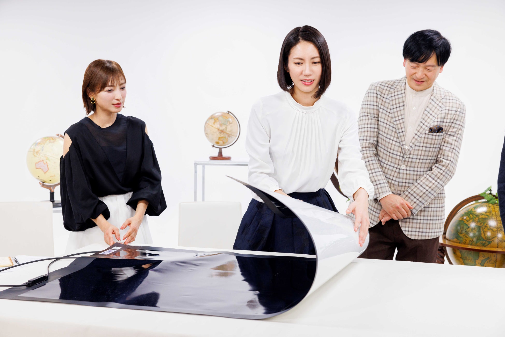 そんな世界の最新技術に対して日本でも様々な技術が誕生しています。その一つが、250mの太陽光発電装置。パネルではなく、薄さ1mmの軽くて曲がるペロブスカイト太陽電池が使用されています。今年4月から開催される2025年日本国際博覧会(大阪・関西万博)のバスターミナルの屋根に設置されるといいます。「この薄さで発電力は変わらないというのはすごい」と感心した松下。スタジオでペロブスカイト太陽電池を実際に手にしてみます。「これならTシャツにつけてスマホの充電に使えるかも」などなど、スタジオでは様々な使い方を提案。夢が広がっていきます。