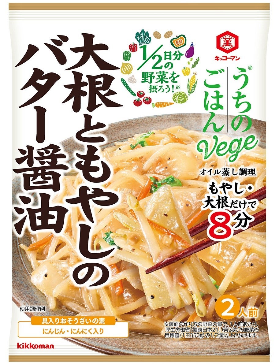 キッコーマン食品株式会社は、8月4日に、1/2日分の野菜(*)を手軽にとることができる「キッコーマン うちのごはんVege おそうざいの素」シリーズの、「白菜とねぎのみぞれ炒め」と「大根ともやしのバター醤油」を全国で新発売します。