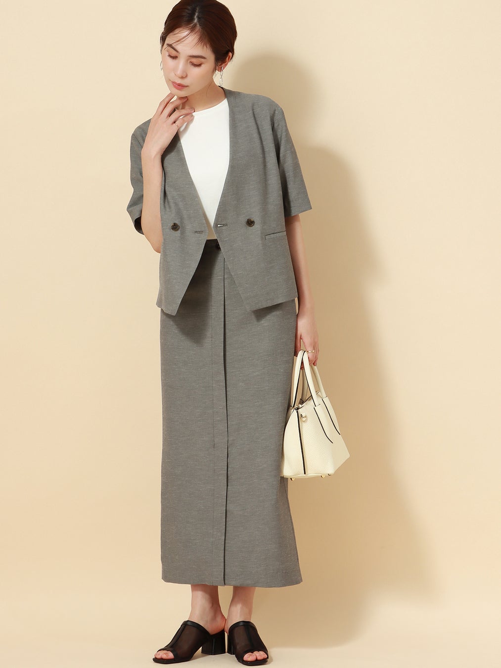 カセット服とは、スーツのように同色同素材で揃えることのできるアイテムで、今回はダブルジャケット・5分袖ショートジャケット・ストレートパンツ・ロングタイトスカート・キャミブラウスの5つを用意。5分袖のショートジャケットは、「きちんと感は出したいけど(長袖)ジャケットはやっぱり暑い」「半袖であっても意外にカーディガンよりきちんと感があるかも!」といったこれまでの単品企画でいただいたお客様の反応から、カセット服の1アイテムとして組み込みました。また、ビジネスアイテムとしては珍しいキャミブラウスは、ジャケットのインナーとしてドレッシーにも、カットソーの上に重ねることでカジュアルにも着こなせる万能アイテムです。各アイテムの丈感やシルエットにこだわり、単品使いでも、様々な組み合わせで着用してもバランスよく着こなせるよう調節しました。