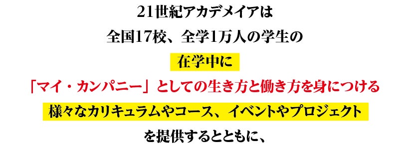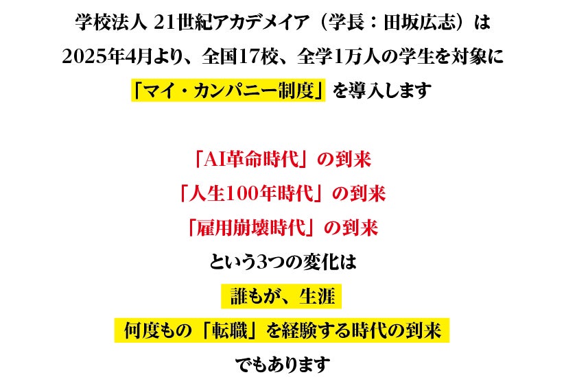21世紀アカデメイアは、4月から全国17校、全学1万人の学生を対象に「マイ・カンパニー制度」を導入。AI革命、人生百年、雇用崩壊の時代に活躍する、即戦力人材を育成