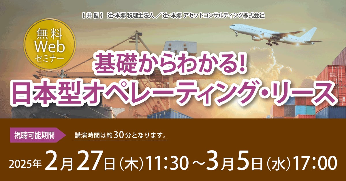 辻・本郷 税理士法人(本社:東京都新宿区、理事長:桑木小恵子)は、辻・本郷 アセットコンサルティング株式会社(本社:東京都新宿区、代表取締役:𠮷川僚)と共催で、2025年2月27日(木)より「基礎からわかる! 日本型オペレーティング・リース」セミナーを開催いたします。航空機や船舶、海上輸送用コンテナを対象とした日本型オペレーティング・リースへの投資は、利益の繰り延べ効果など、そのユニークな特長から年々市場規模を拡大し、2025年には5,000億円を超えると予想されています。本セミナーでは、日本型オペレーティング・リースの仕組みから具体的な投資効果、活用のヒントやリスクまで、業界最大手の組成責任者の講師にわかりやすく解説していただきます。