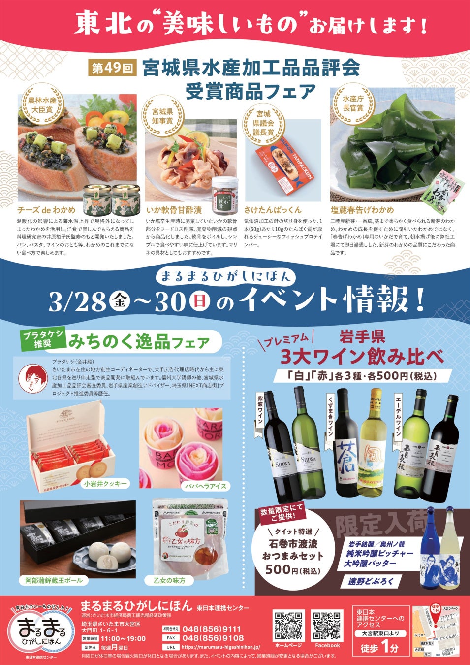 東⽇本の「ヒト・モノ・情報」が⼤宮に集合!⼤宮駅東⼝から徒歩1分のところにある、交流・発信・活性化を促す地⽅創⽣の場「まるまるひがしにほん(東⽇本連携センター)」で、「第49回宮城県水産加工品品評会受賞商品フェア」を開催します!3月28日(金)~30日(日)の3日間限定イベントです。宮城県水産加工品品評会で農林水産大臣賞を受賞した「チーズdeわかめ」や、宮城県知事賞を受賞した「いか軟骨甘酢漬」などの受賞商品を販売します。そのほか、岩手県3大ワイン飲み比べセットや数量限定で石巻市渡波おつまみセットを販売します。この機会にぜひご来館ください!