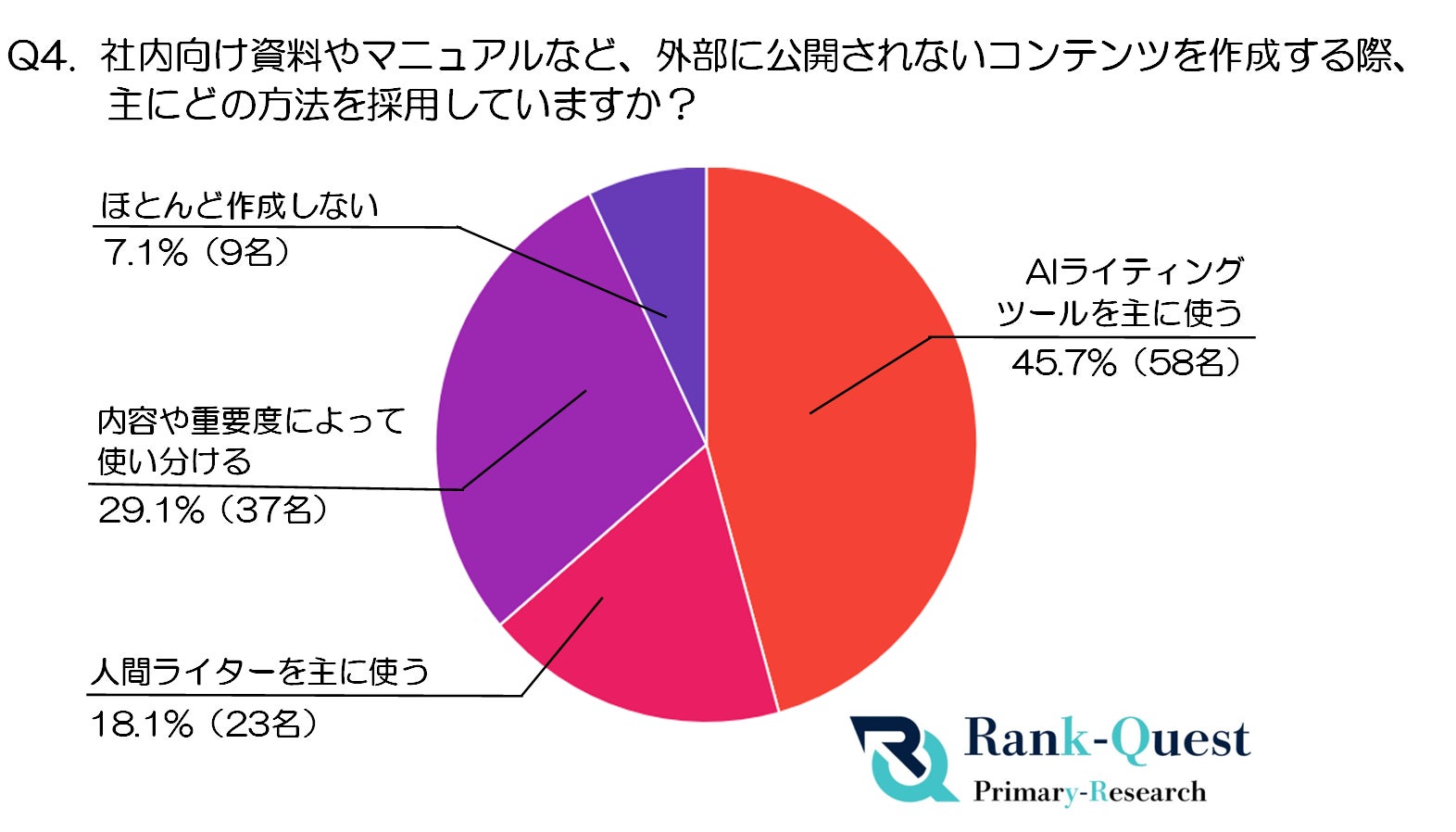 一方、「人間ライターを主に使う」との回答は18.1%と比較的少なく、社内限定のコンテンツではAIが特に効率化や標準化の面で評価されていると考えられます。