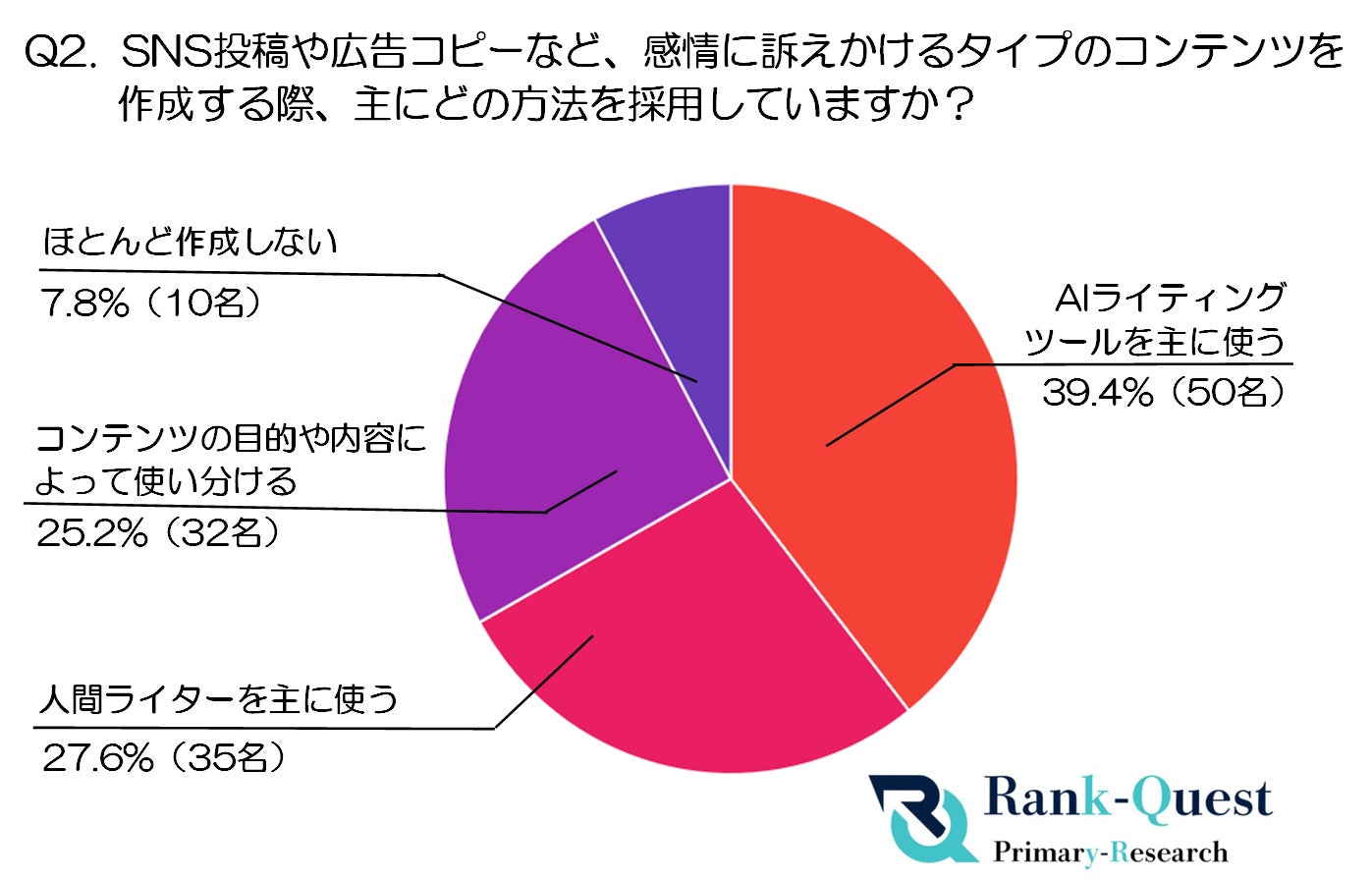 今回のアンケート結果では、SNS投稿や広告コピーなど感情訴求型コンテンツの作成において、「AIライティングツールを主に使う」という回答が最も多く39.4%となりました。この結果から、感情表現や共感性が求められる分野であってもAIの活用が進んでいることが明らかになりました。